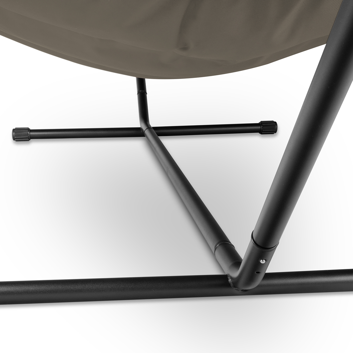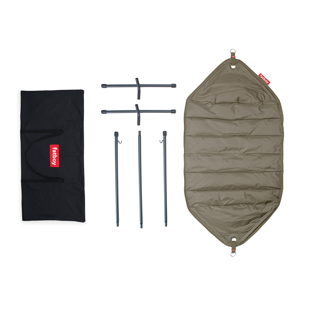 Das Gerüst der Fatboy Headdemock Deluxe lässt sich zum Aufbau einfach zusammenstecken. Die Hängematte selbst wird an den Haken des Gestänges eingehängt. Um die Höhe der Matte zu justieren und zu verhindern, dass sie zu nahe am Boden hängt, kann sie via Klettverschlüssen an beiden Enden der Länge nach eingestellt werden.