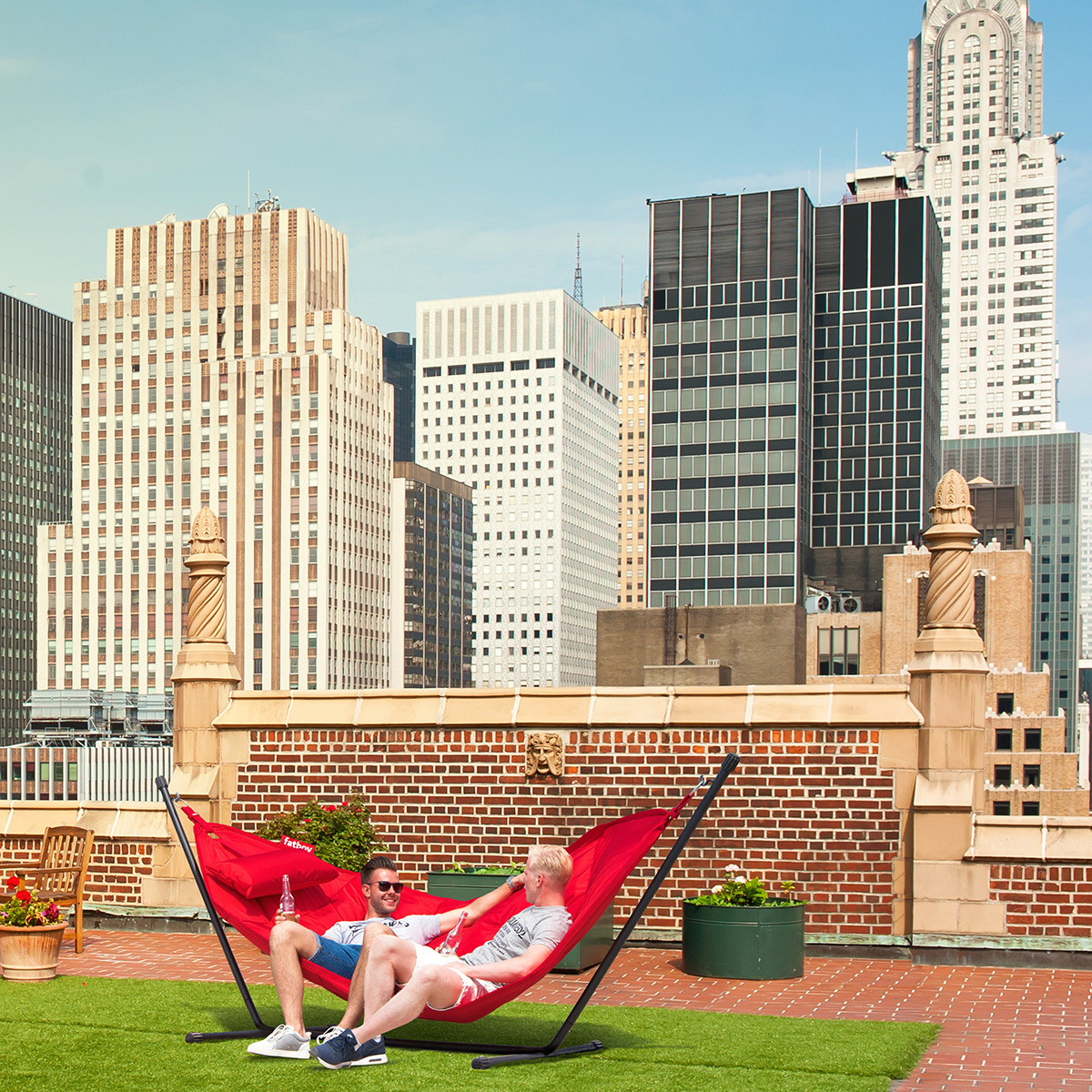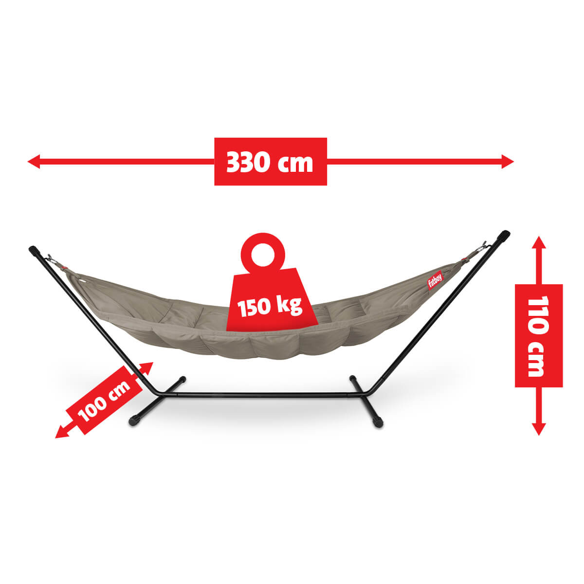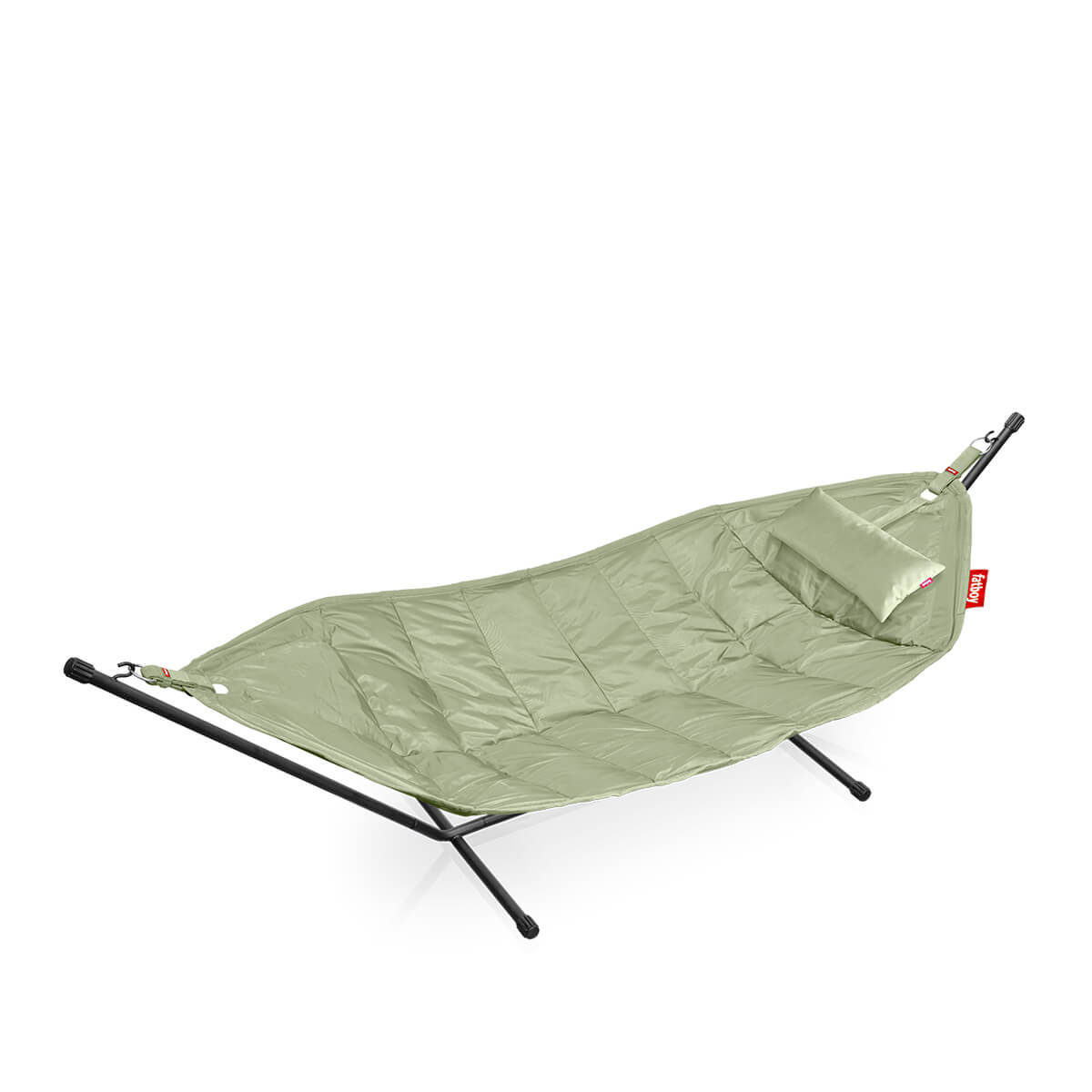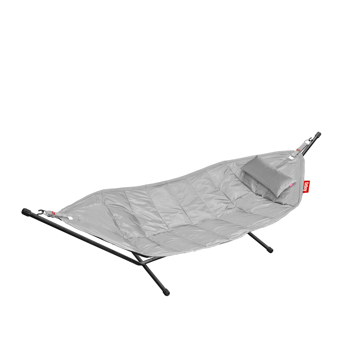 Die extragroße Liegefläche bietet ausreichend Platz für zwei Personen (max. 150 kg) und lässt sich dank des strapazierfähigen, wetterbeständigen Materials problemos im Freien nutzen. Für einen angenehmen Liegekomfort sorgt die weiche Polsterung. Noch gemütlicher wird es mit dem beiliegenden Headdemock Kissen, das der Fatboy Hängematte einfach über den Metallpin angehängt werden kann.