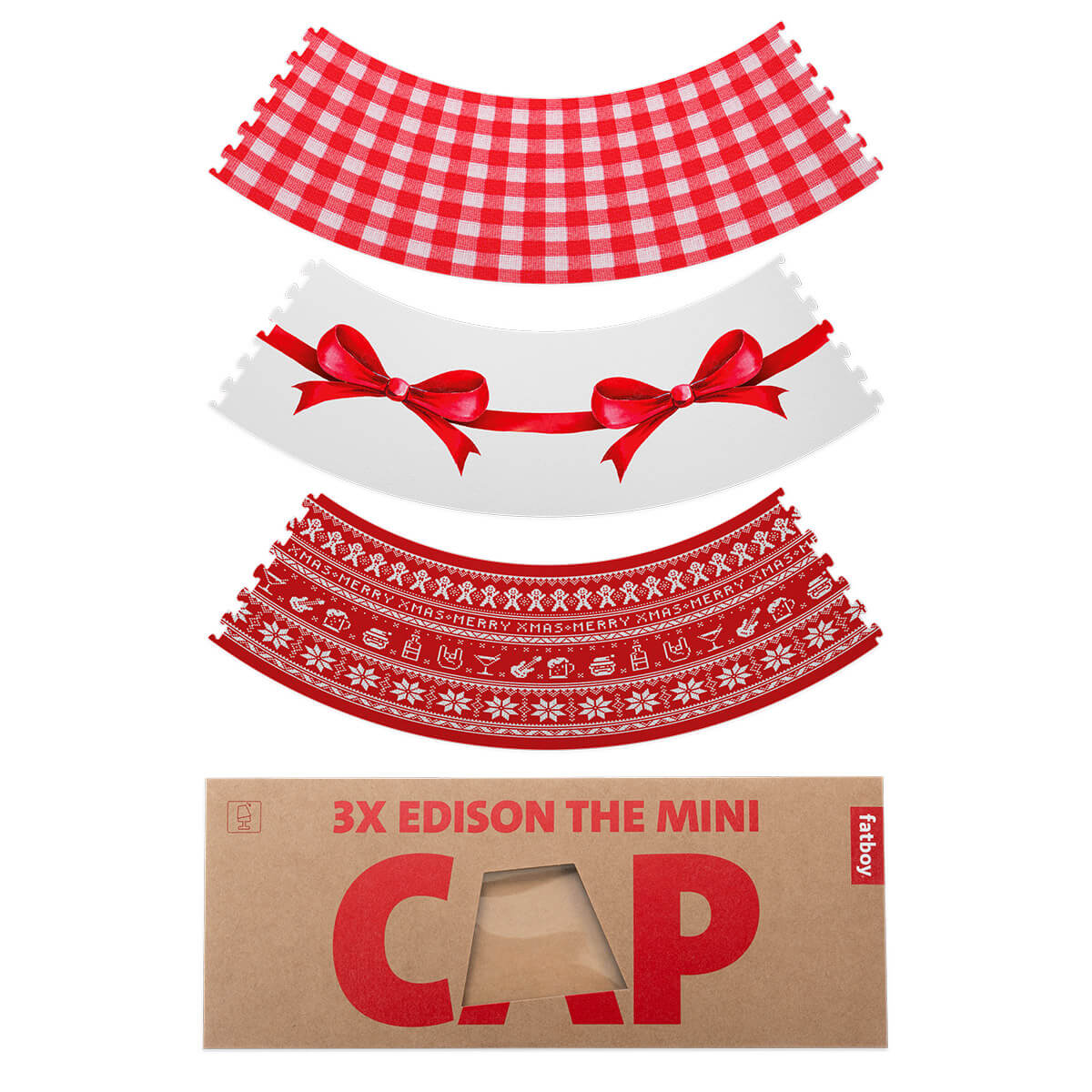 Mit den Mini Cappies Surprise verwandeln Sie Ihre Fatboy Edison the Mini Lampen in originelle Weihnachtslichter. Die Designschirme, die festliche Motive wie eine rote Schleife und das Muster eines weihnachtlichen Strickpullovers zeigen, lassen sich den beliebten Akkuleuchten einfach von oben her aufsetzen. Bitte beachten Sie, dass die Schirme nicht vormontiert geliefert werden, sondern in einem flachen Fatboy Umschlag. Sie können jedoch in einem einfachen Handgriff zusammengesteckt werden.