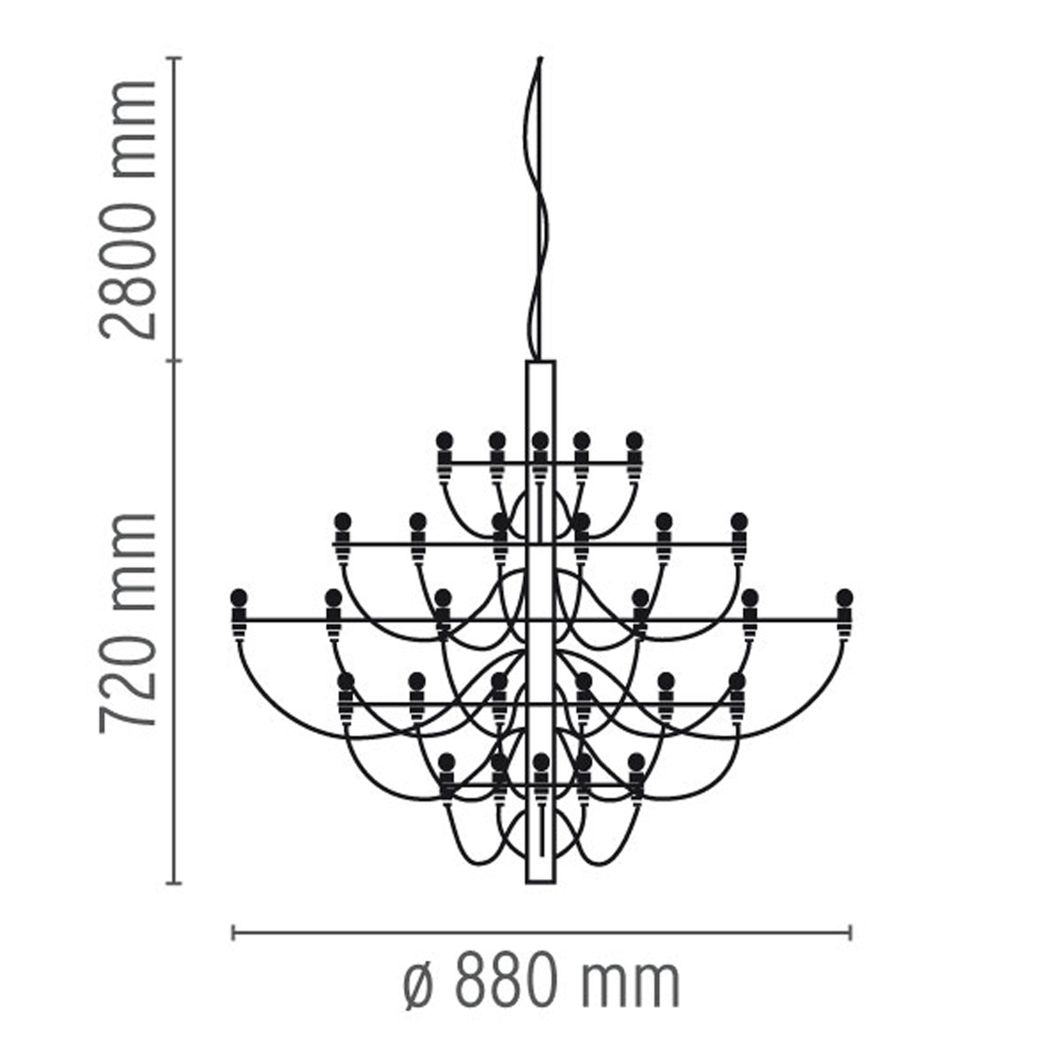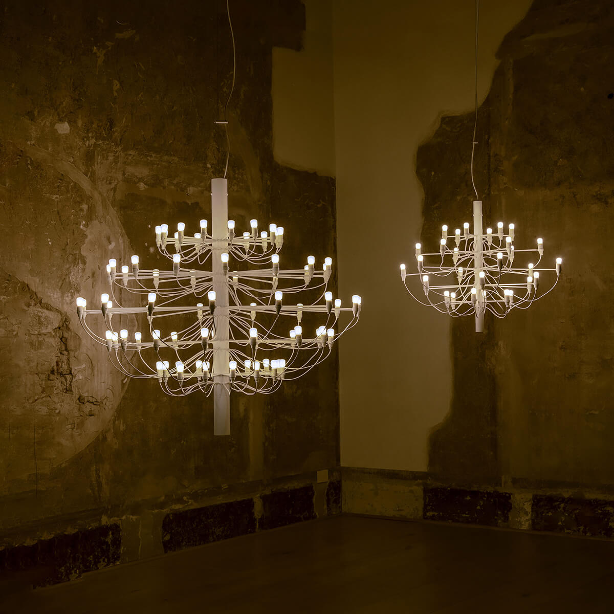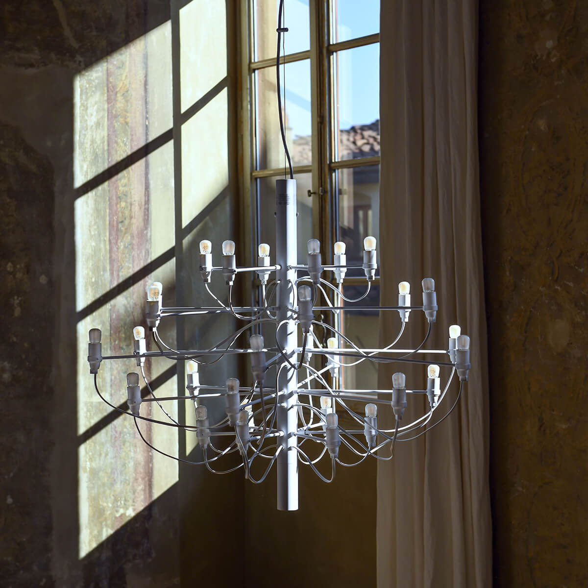 The 2097/30 model, created in 1958 by the designer Gino Sarfatti, combines a classic design language with clear lines and shiny surfaces. The pendant lamp consists of a central iron rod around which numerous thin brass arms are arranged. These support the bulb holders, which are reminiscent of the abstract implementation of classic candlesticks.