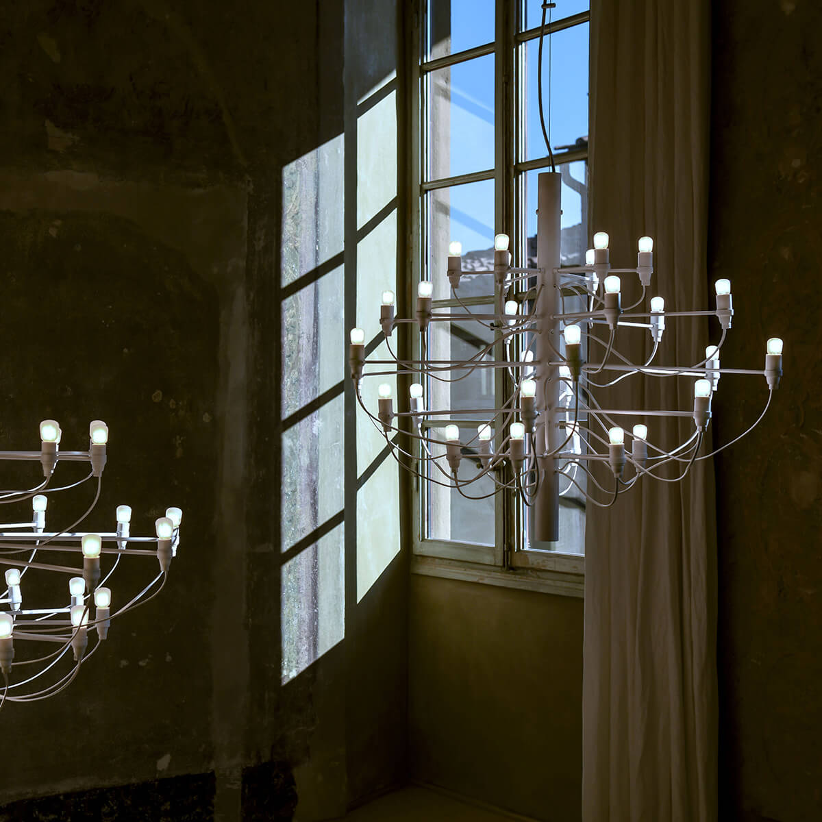 The delicately designed, elegant structure gives the Flos 2097/30 pendant light a distinctive appearance, which becomes even more opulent when switched on - when the numerous light sources are reflected in the sparkling surfaces. The matt black version of the luminaire is somewhat less luxurious but much more timeless.