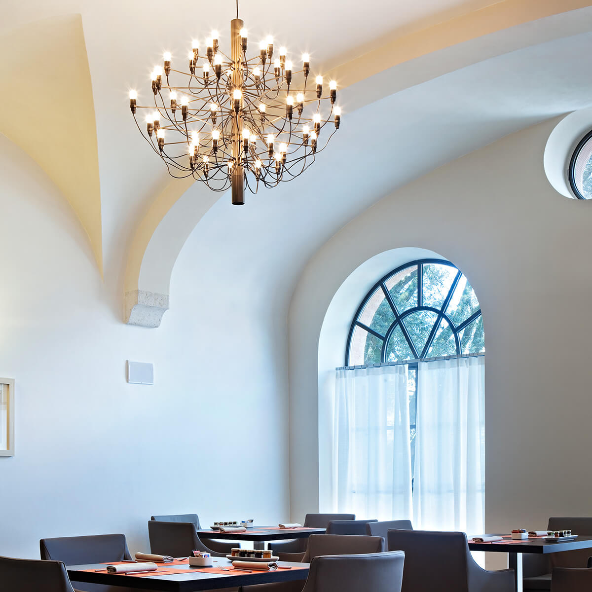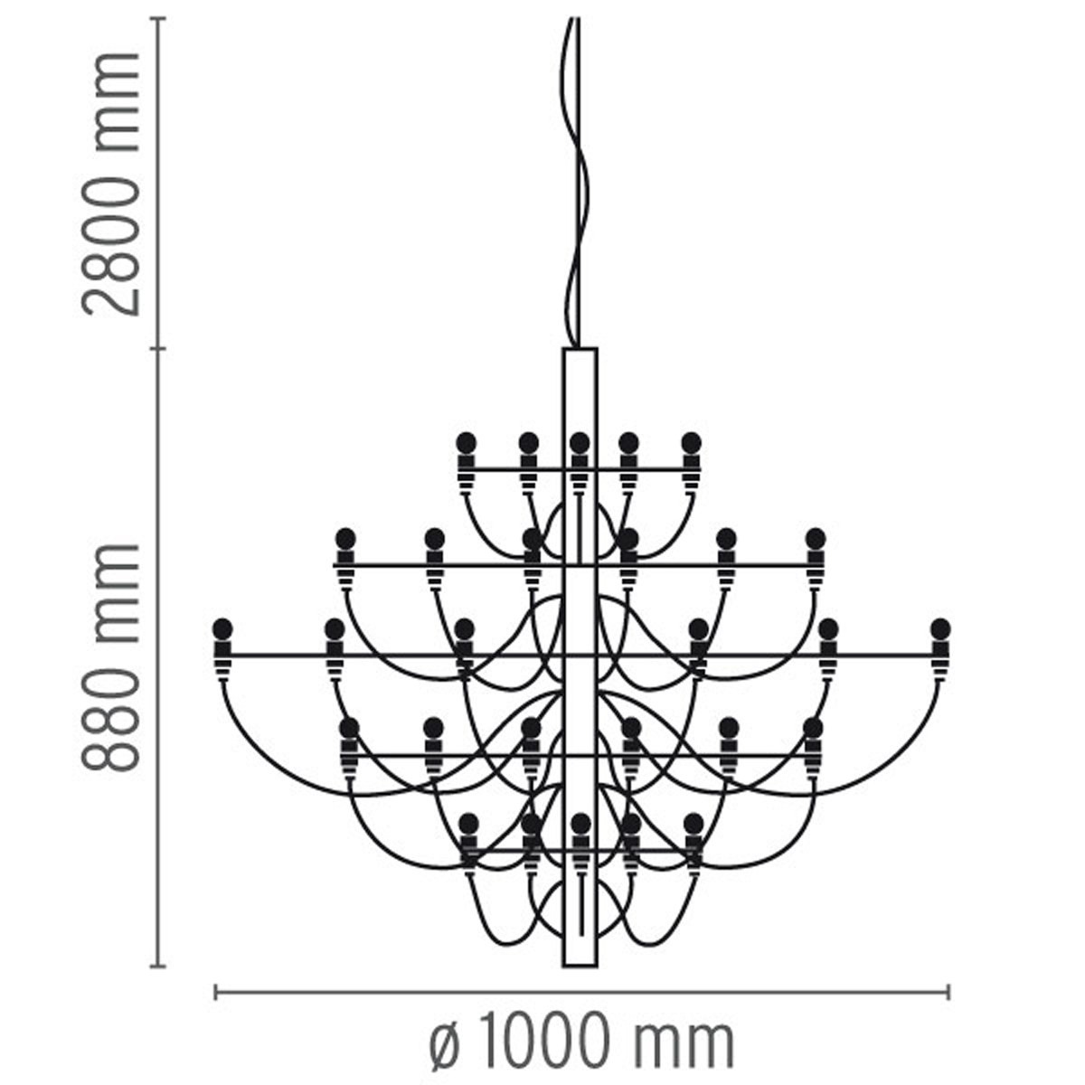 The 2097/50 from Flos is a masterpiece of lighting that impresses with its elegant structure and pleasant diffuse lighting effect. With its structure made of iron rod and brass arms, which are chrome-plated, matt lacquered or finished in gold, it brings a touch of luxury to any room. A steel canopy completes the design and ensures a secure attachment to the ceiling.