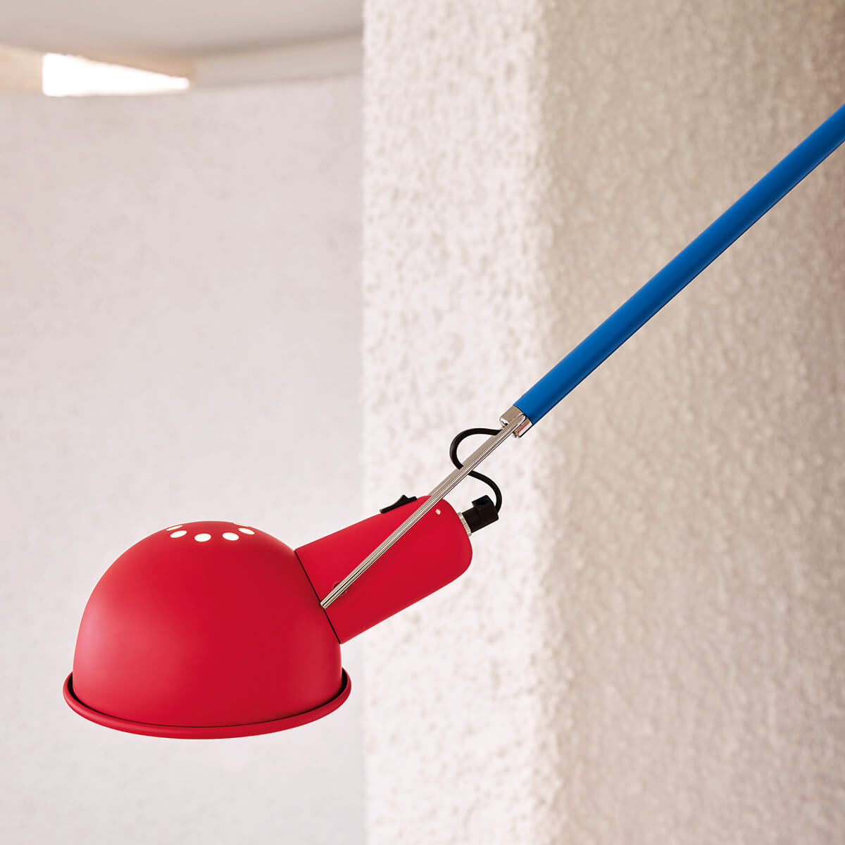 The Flos 265 Chromatica wall lamp is operated via a toggle switch on the red lamp head. The lamp is equipped with an approximately 2 meter long electric cable for the power supply, the plug of which can simply be plugged into a nearby socket.