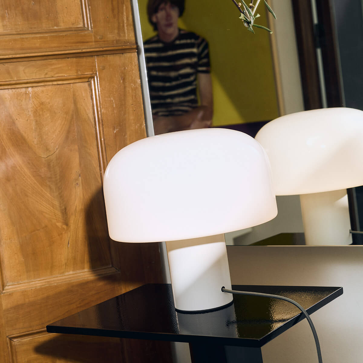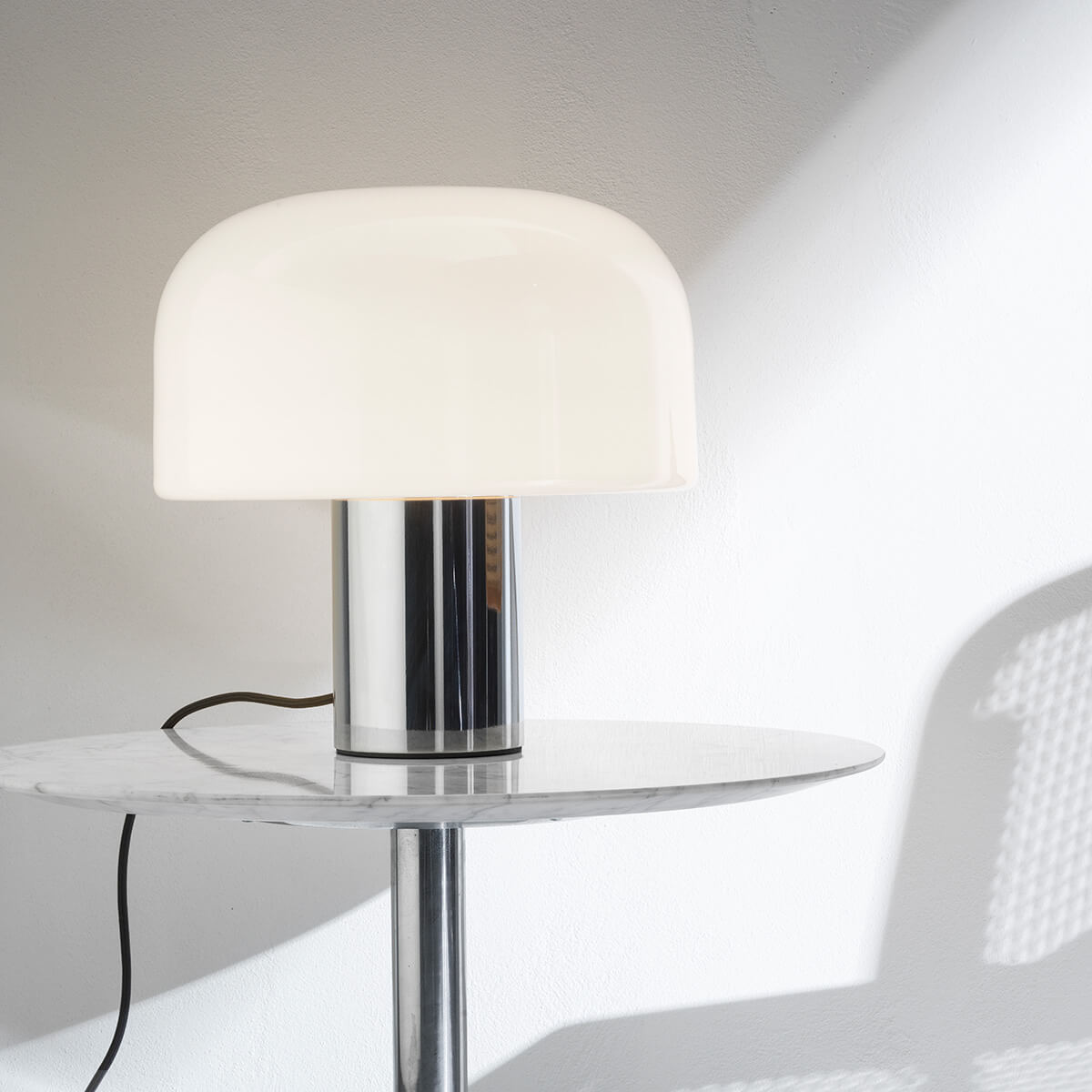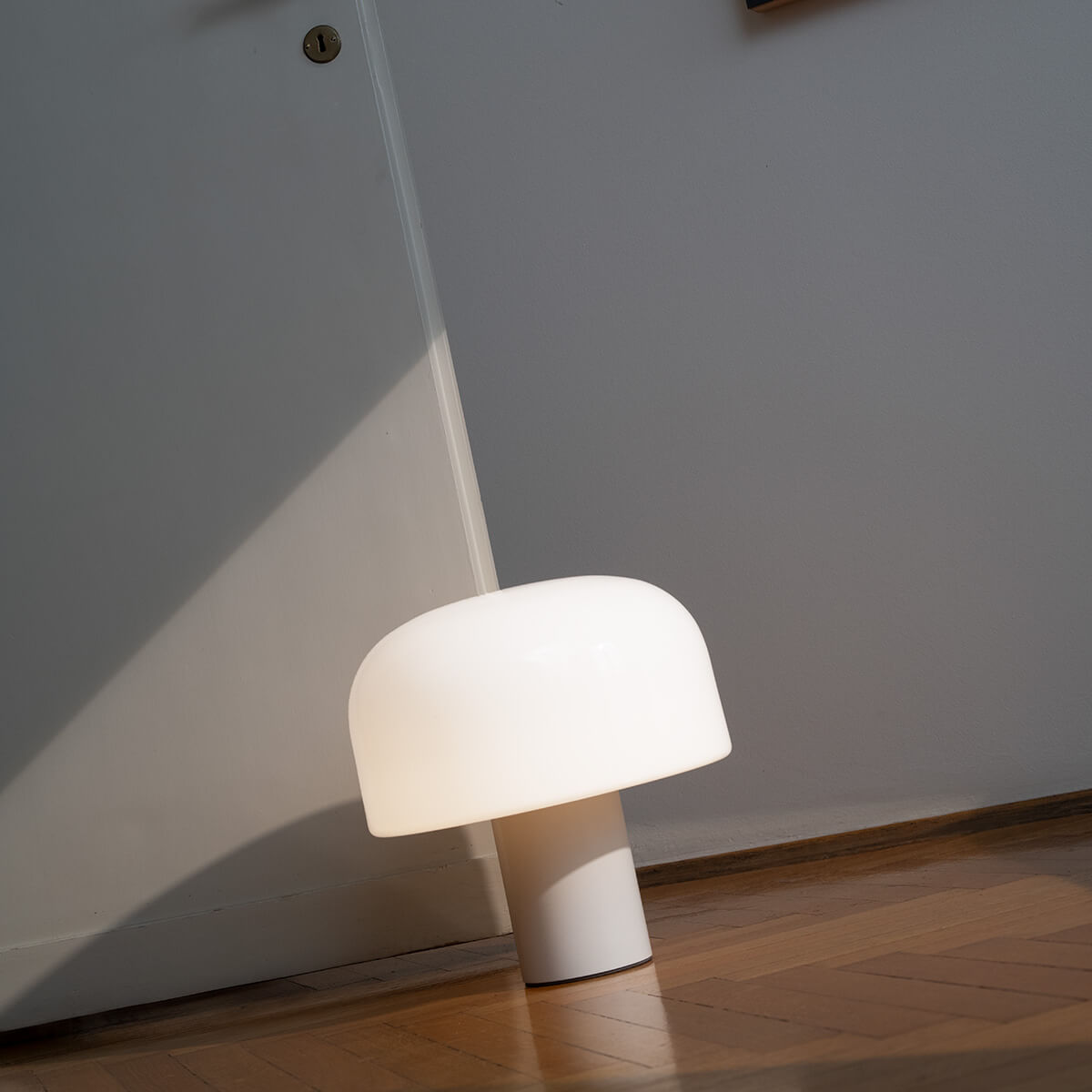 The heart of the Bellhop Glass T is its elegant lampshade, which is made of multi-layer triplex opal glass . This innovative technology, which was developed in collaboration with the Flos R&D department, ensures gentle light diffusion without glare. The clever variation of the layer thicknesses creates a soft, diffuse light that bathes the room in a cozy atmosphere.