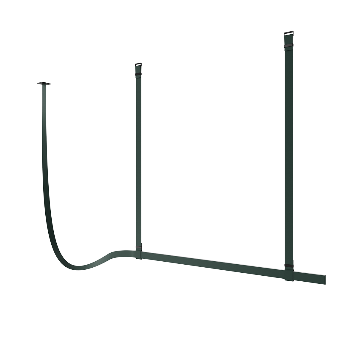 The luminaire, which looks like a light installation, is made entirely of genuine leather in natural, green or black tones. The slender aluminum profile is encased in leather, creating an upward and downward light emission. Flat leather straps, which are attached to the ceiling with metal buckles, serve as pendants. The power connection is made via a leather loop on the side, which is connected to the lighting profile via an integrated micro connection.