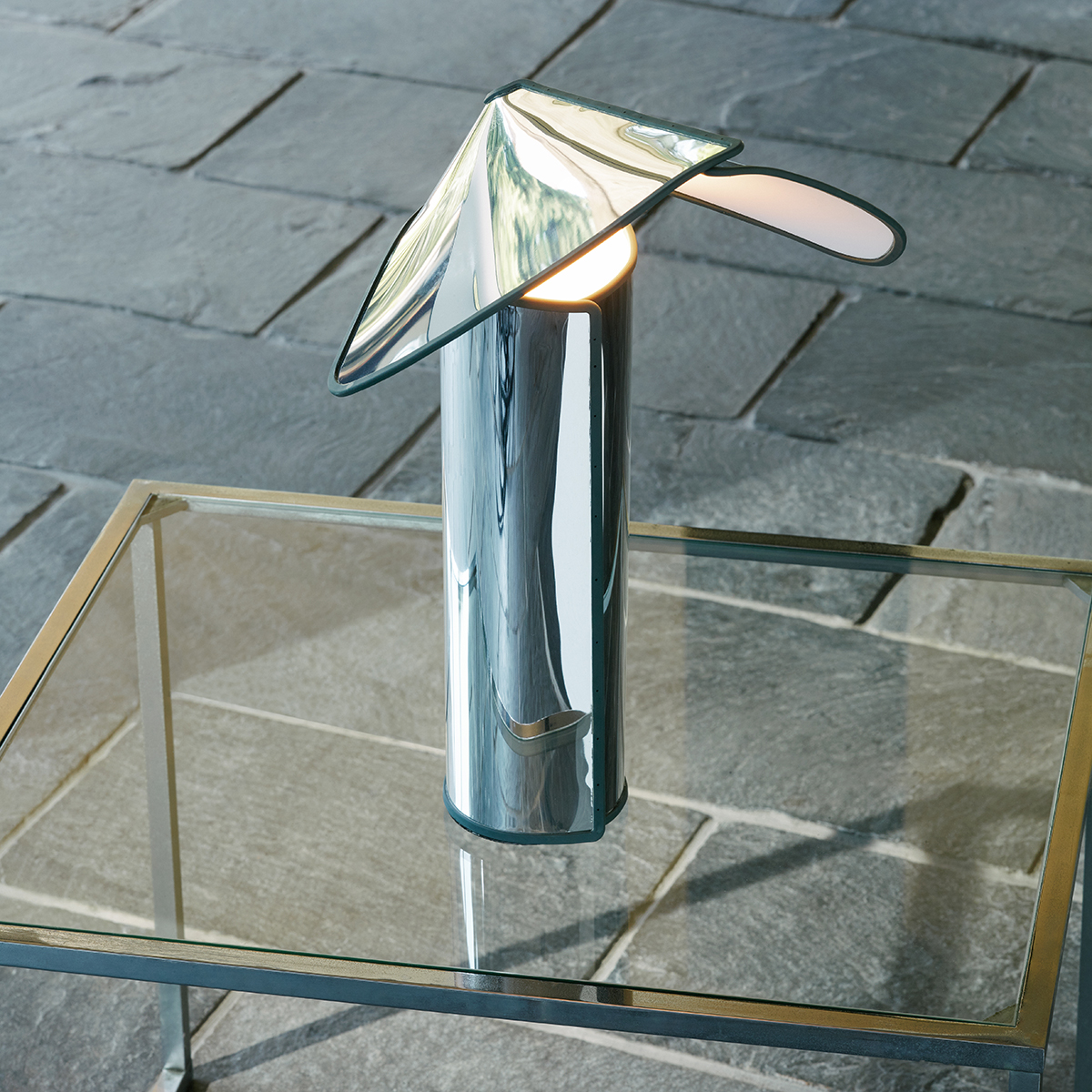 - Elegantly curved luminaire body made of white foiled aluminum on the inside