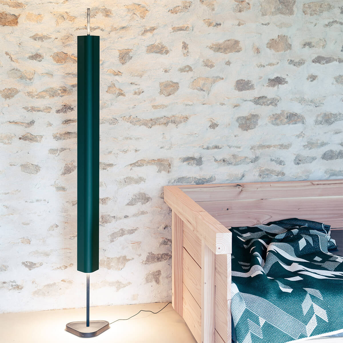 Mit ihrem monolithisch anmutenden, dreieckigen Schirm und dem schlanken Leuchtenfuß präsentiert sich das Design der EMI als eine schwebende Erscheinung mit architektonischer Linienführung. Schirm und Stab der Lampe bestehen aus hochwertigem Aluminium mit 6063-T5-Legierung. Die notwendige Standfestigkeit garantiert der elegant gerundete Sockel aus Gusseisen.
