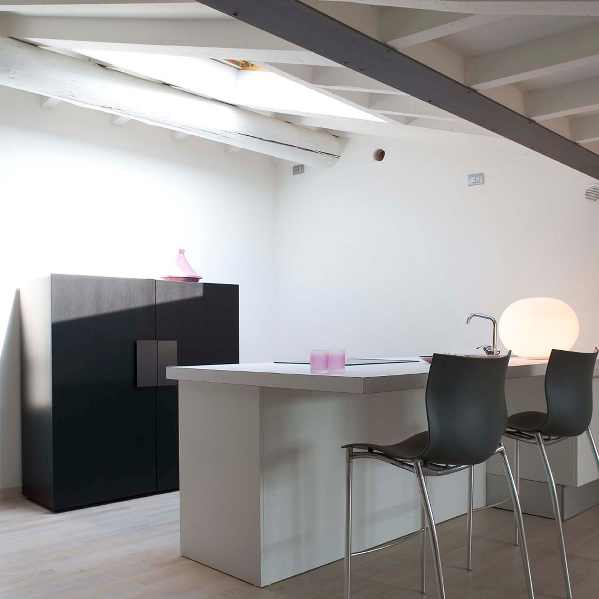 Gefertigt ist der zeitlos schöne Leuchtenkörper aus mundgeblasenem, säuregeätztem Glas, dessen opalweiße Oberfläche ein diffus gestreutes Licht erzeugt. Die Diffusorhalterung besteht aus grau lackiertem, druckgegossenem Aluminium. Als Basis dient der Leuchte ein abgerundeter Sockel aus fiberglasverstärktem Polyamid.
