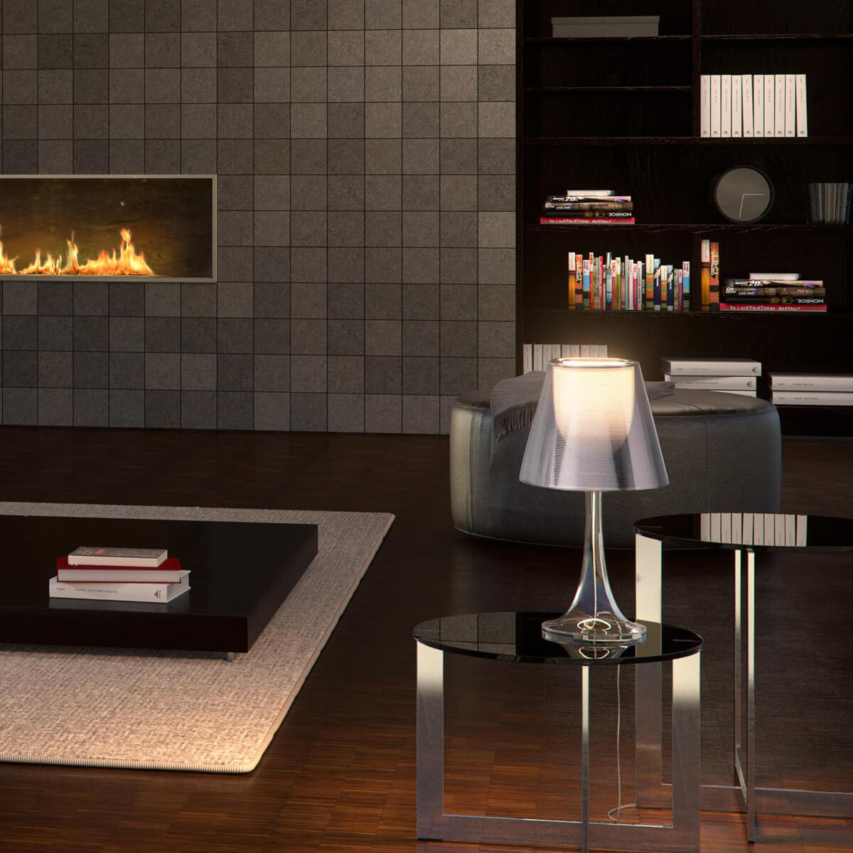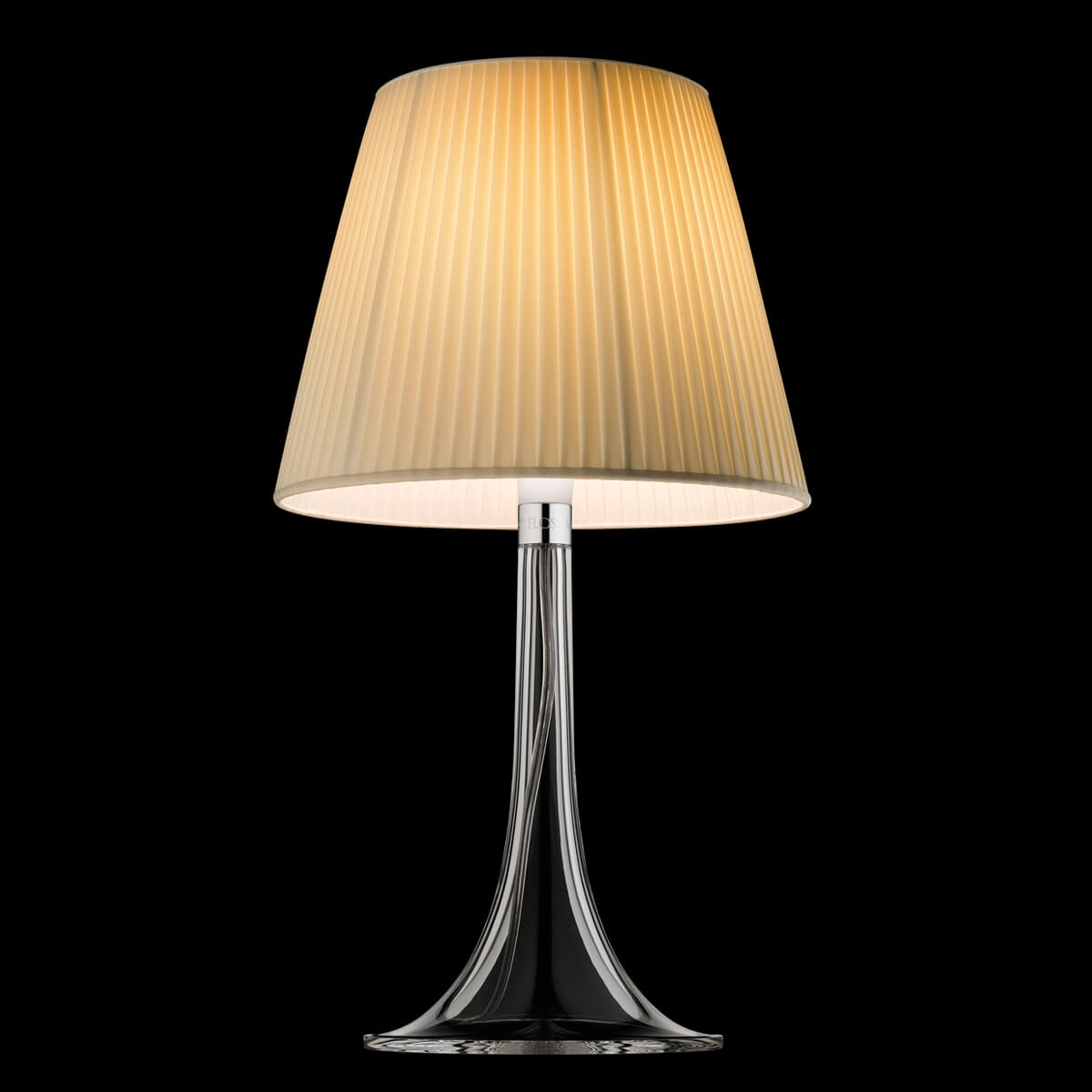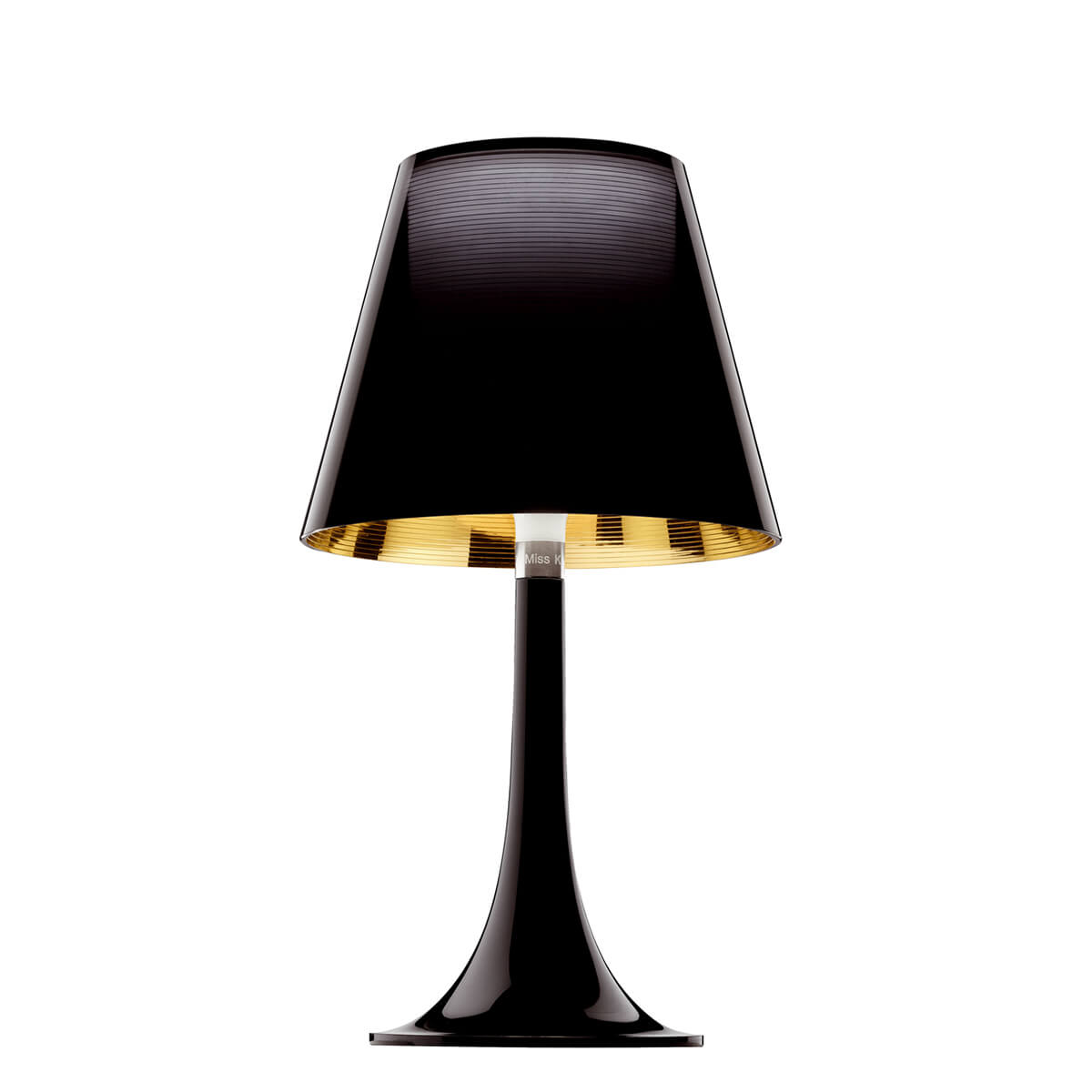 So besteht der elegant geschwungene Leuchtenfuß aus transparentem, spritzgegossenem Polymethylmethacrylat (PMMA). Zwei Diffusoren bilden den Schirm der Miss K Tischlampe: Der innere besteht aus opalem Polycarbonat und gewährleistet ein diffus gestreutes, blendfreies Licht.