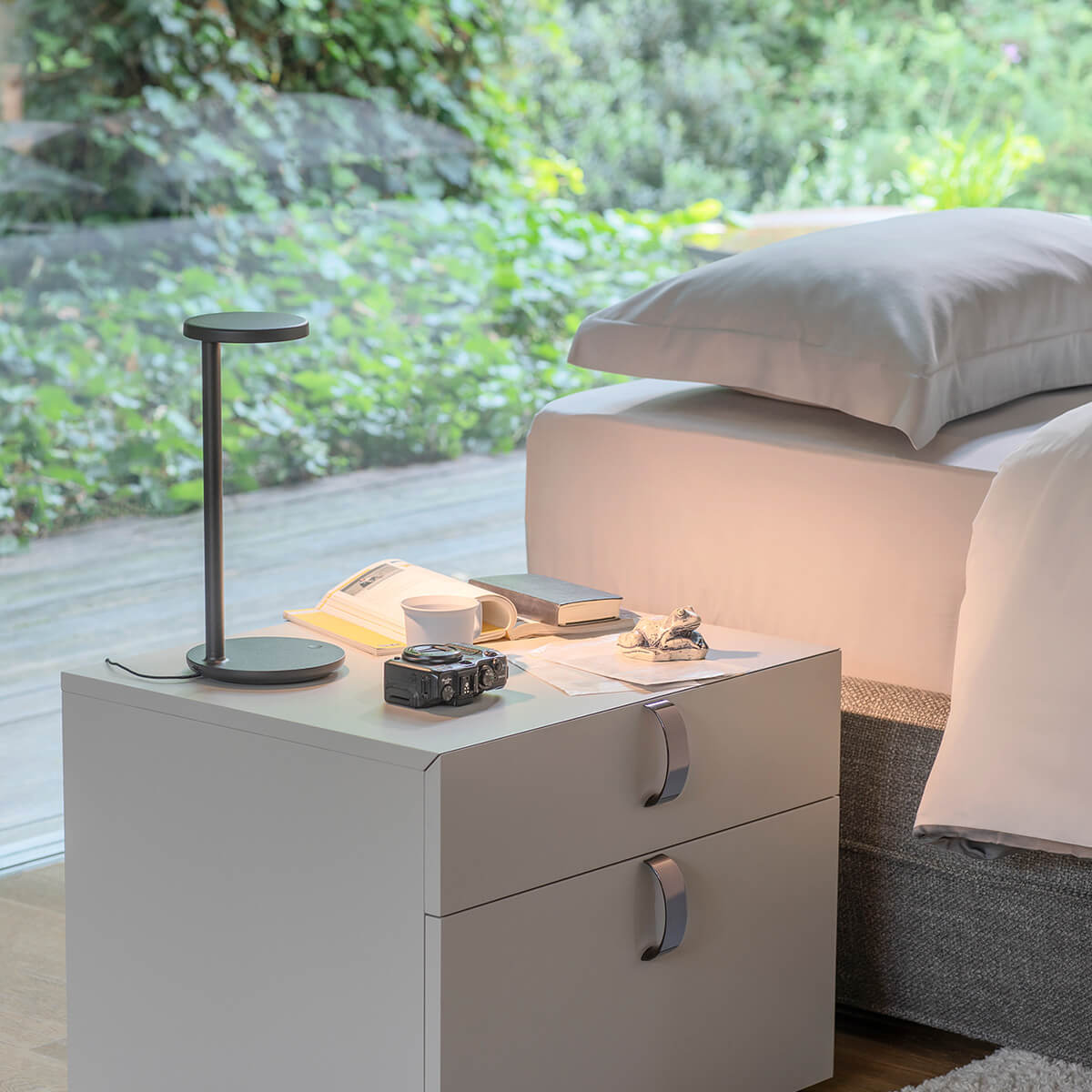 Ein Touchdimmer im Sockel erlaubt die stufenlose Anpassung der Lichtintensität. Dank Memory-Funktion merkt sich die Tischlampe Ihre letzte Helligkeitseinstellung – und über die Timer-Funktion können Sie festlegen, wann sich die Lampe automatisch ausschaltet. Das macht Oblique Qi nicht nur intelligent, sondern auch besonders benutzerfreundlich.