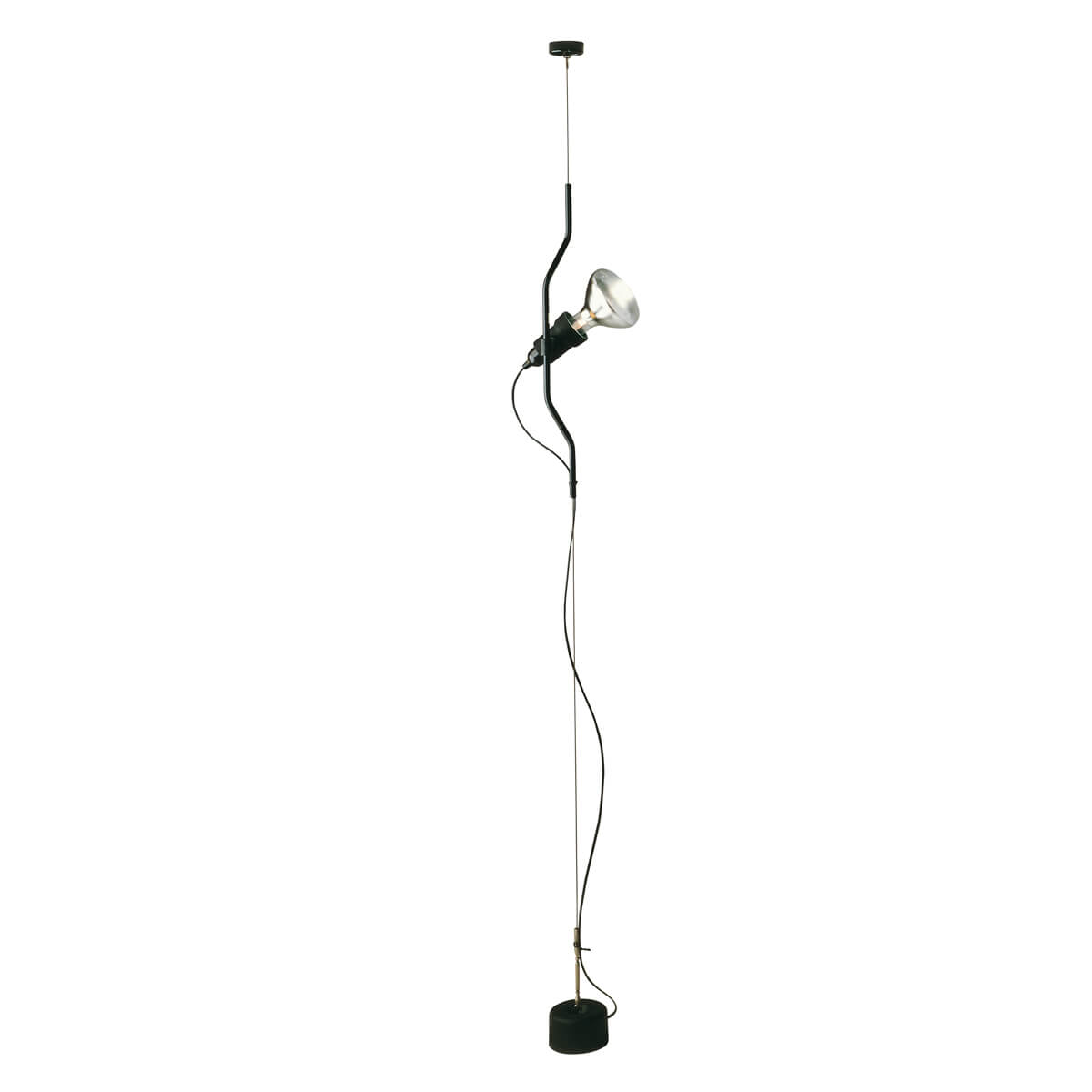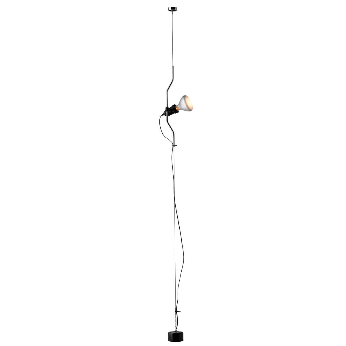 Das Besondere an der Parentesi von Flos: Das Leuchtenelement ist an einer Stahlseilaufhängung installiert, die vom Boden bis zur Decke gespannt eine markante vertikale Linie bildet. Deckenbaldachin und Bodengewicht, beides in schwarzer Farbe gehalten, dienen zur Verankerung der Pendelleuchte.