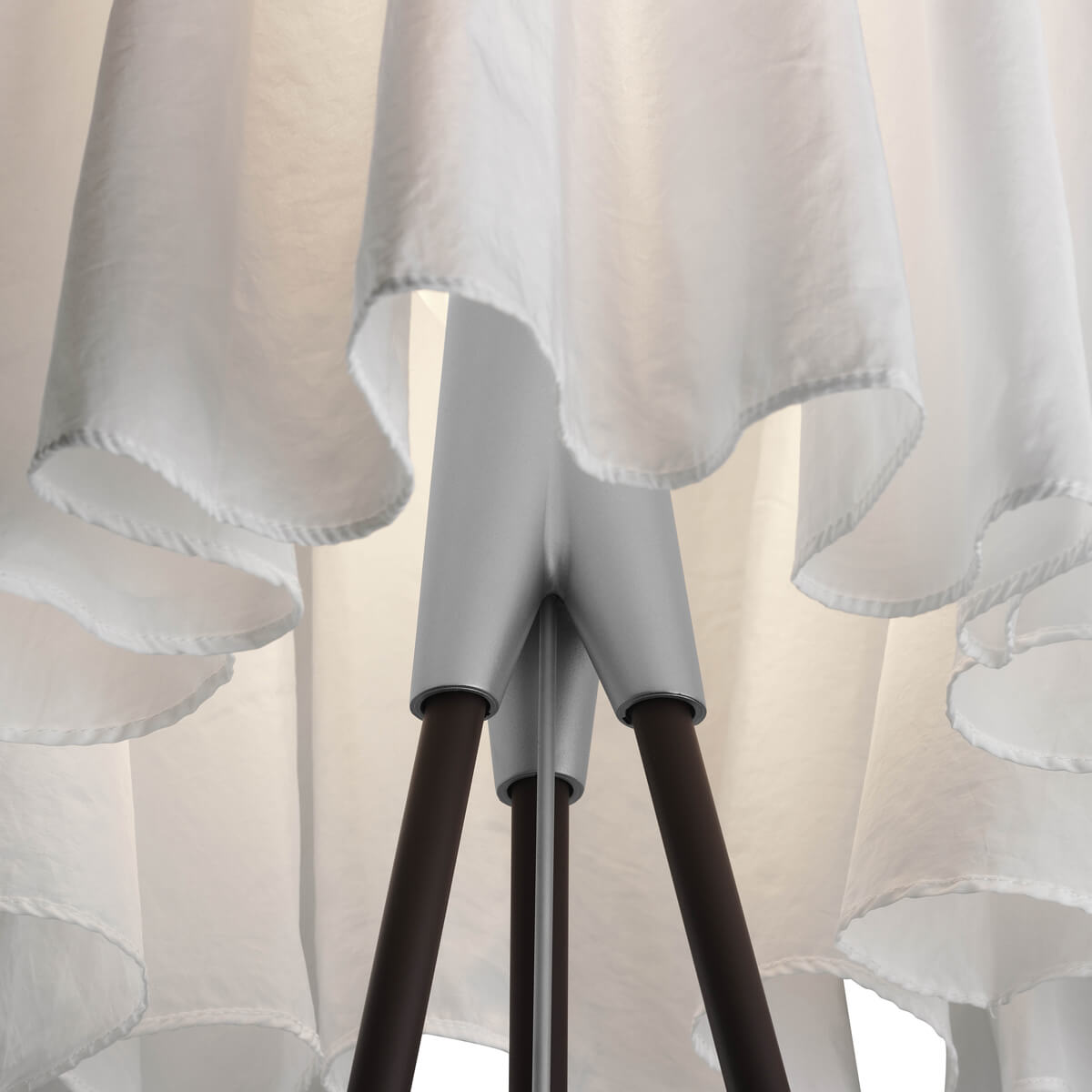 Als Leuchtenfuß dient der Flos Rosy Angelis Stehleuchte ein dreibeiniger Schaft aus dunkelgrauem Aluminium, der sich dem Design als grazil gestaltetes Element unterordnet. Die Betätigung und Lichtstärkeregulierung der Leuchte erfolgt über einen an der Leuchtenhalterung befindlichen Drehdimmer, der sich über ein satiniertes Aluminiumstäbchen bedienen lässt.