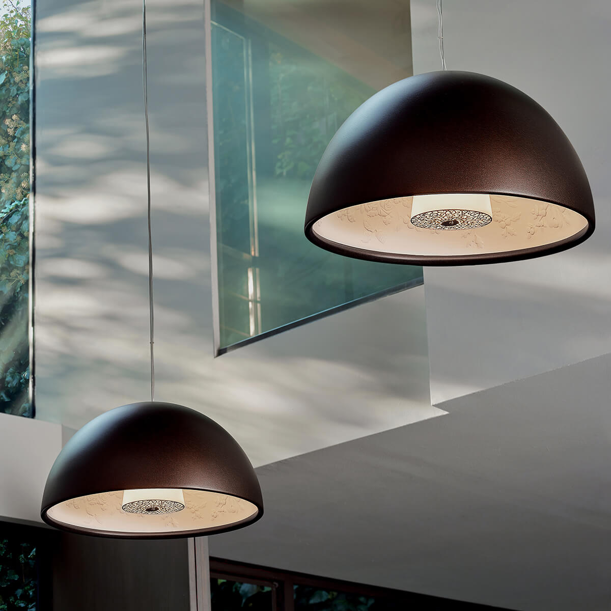 Die innere Kuppel besteht aus mechanisch bearbeitetem Gipsguss und wird von einem Diffusor aus mundgeblasenem Opalglas ergänzt. Dieses sorgt für eine sanfte, gleichmäßige Lichtausstrahlung, die eine warme und einladende Atmosphäre schafft. Erhältlich ist die Skygarden Small in mehreren stilvollen Farbvarianten: Rostbraun, Mattschwarz, Weiß glänzend und Gold matt. Der Baldachin ist passend zur jeweiligen Schirmfarbe gestaltet, sodass sich die Hängelampe harmonisch in verschiedene Einrichtungsstile einfügt.