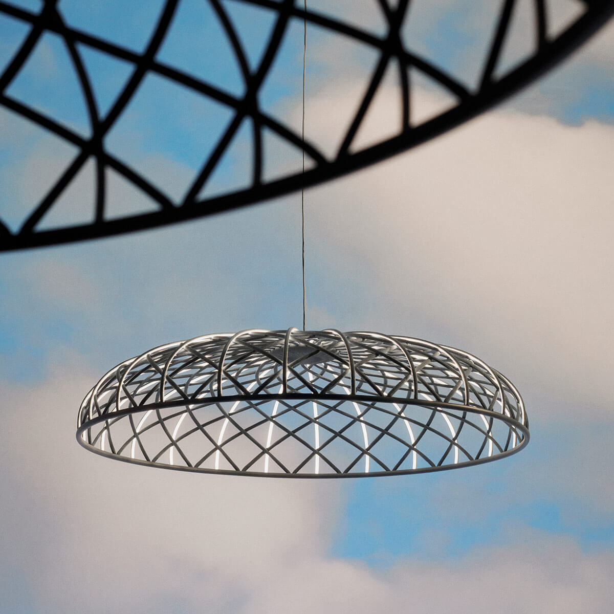 Dank eines ausgeklügelten Ausbalancierungssystems im oberen Teil der Kuppel ist die Skynest LED Pendelleuchte stets perfekt ausgerichtet. Ein Aluminiumring schließt den unteren Teil der Kuppel ab und hält die gesamte Netzstruktur mithilfe eines robusten Stecksystems zusammen.