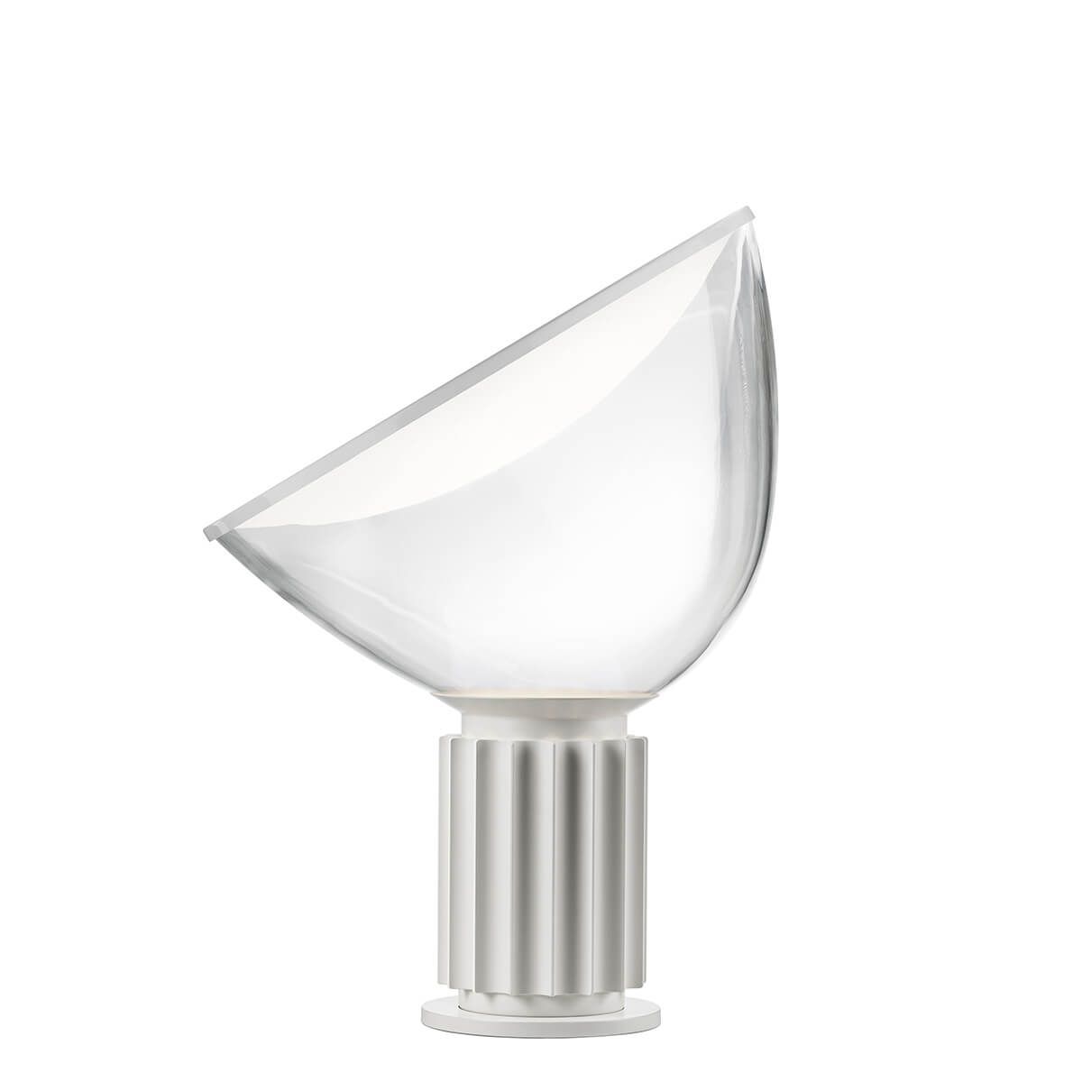Blickpunkt des Designs ist der voluminöse Lampenschirm aus transparentem, mundgeblasenem Glas. Er ist einstellbar, um die Lichtverteilung der Taccia Small LED Tischleuchte diskret zu variieren. Der Oberseite des Schirms liegt ein Reflektor auf, der außen weiß glänzend lackiert und innen mattweiß gehalten ist. Das aus dem Sockel emporstrahlende Licht wirft er sanft zurück und streut es auf gleichmäßige Weise auf die umliegenden Flächen. Gefertigt ist der Sockel aus extrudiertem Aluminium mit mattem oder eloxiertem Finish.