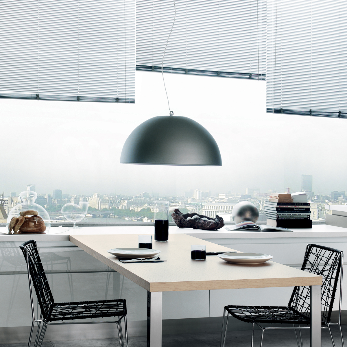 Bei der Cupola Media handelt es sich um ein Lichtobjekt von zeitlosem Design, das sich zur direkten Beleuchtung von Tischflächen eignet. Schlicht in der Form und dank der aluminiumgrauen Lackierung von einem gewissen Industrie-Chic bestimmt, fügt sich die Leuchte ihrer Umgebung auf diskrete Weise ein. Geeignet ist die Hängeleuchte für das private Esszimmer oder Küchen, aber auch für Kantinen, Restaurants oder Arbeitsräume.