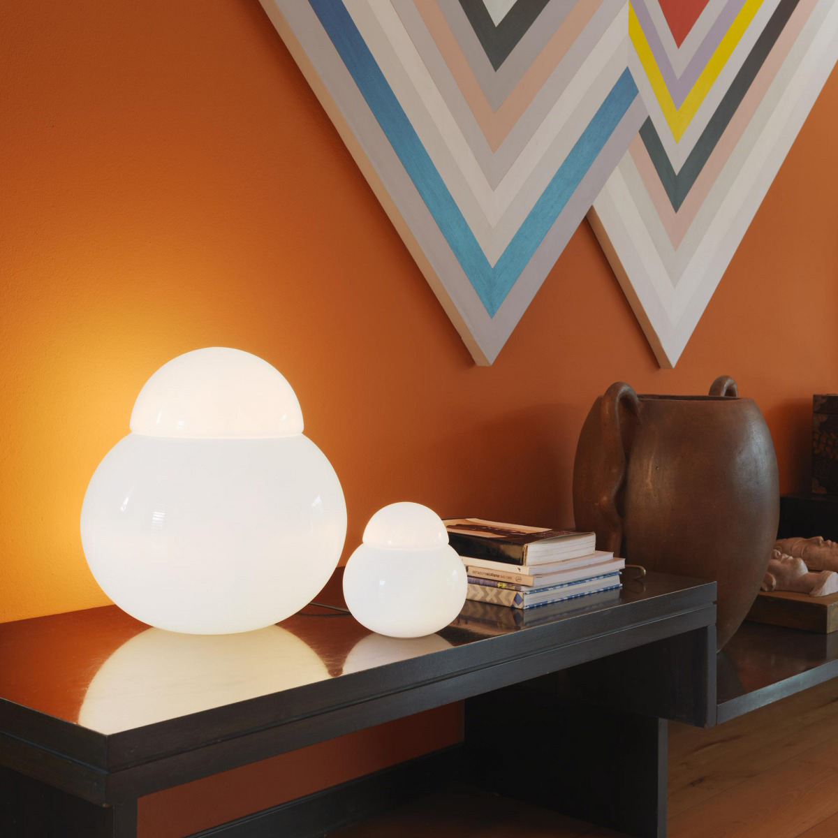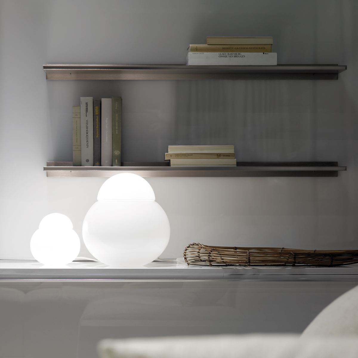 Zwei kugelartig geformte Diffusoren aus mundgeblasenem, weiß glänzendem Glas bilden den Leuchtenkörper und erzeugen ein angenehm helles, diffus gestreutes Licht. Die kurvige Linie verleiht der Fontana Arte Daruma eine sympathische Form, die Assoziationen weckt an die gerundete Silhouette russischer Matroschka-Puppen.