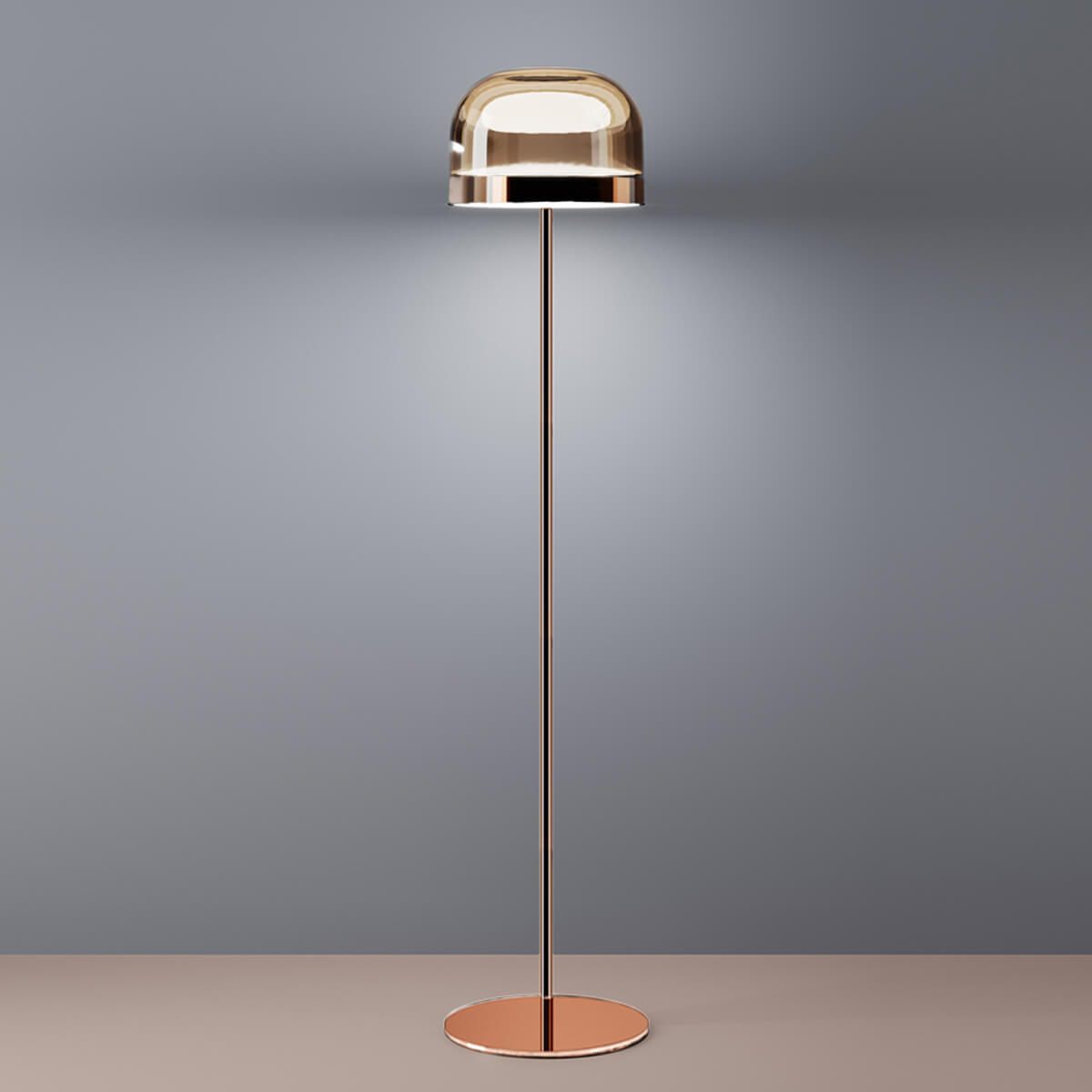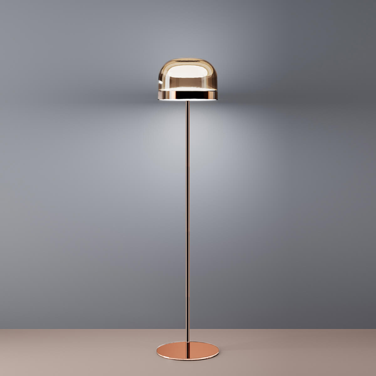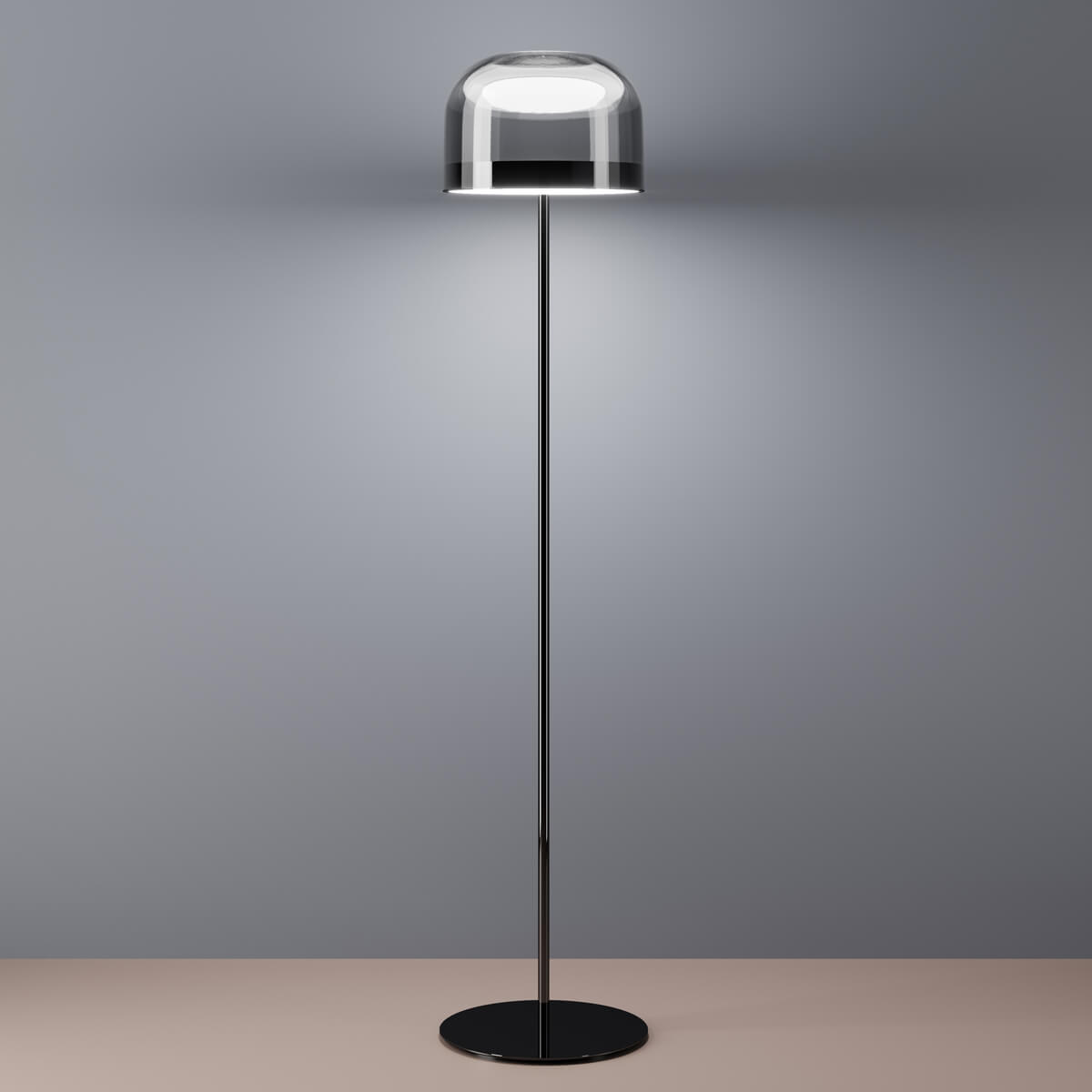 Während die untere Scheibe das Licht gezielt nach unten abgibt und so für funktionale Beleuchtung sorgt, bringt die obere den transparenten, farbig getönten Glasdiffusor von innen zum Strahlen. Dieses raffinierte Zusammenspiel schafft eine warme, diffuse Lichtwirkung und verleiht der Leuchte eine nahezu schwebende Leichtigkeit. Die Equatore Stehleuchte eignet sich ideal für Wohnzimmer, Lounge-Bereiche oder stilvolle Homeoffice-Konzepte und setzt auch in Hotels oder repräsentativen Geschäftsräumen ein elegantes Statement.