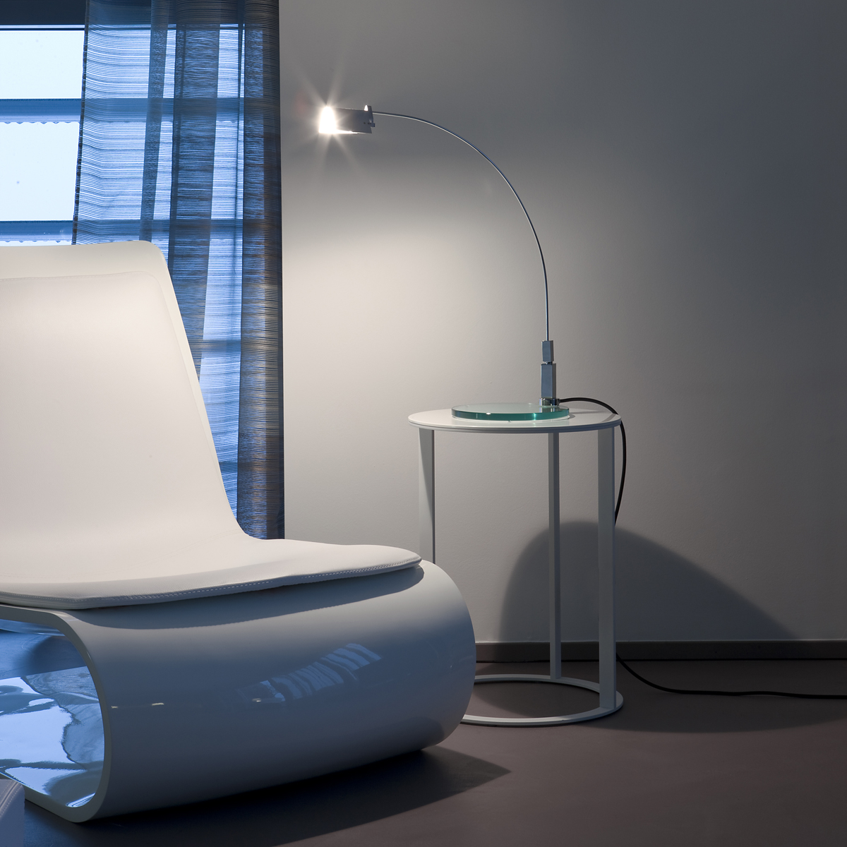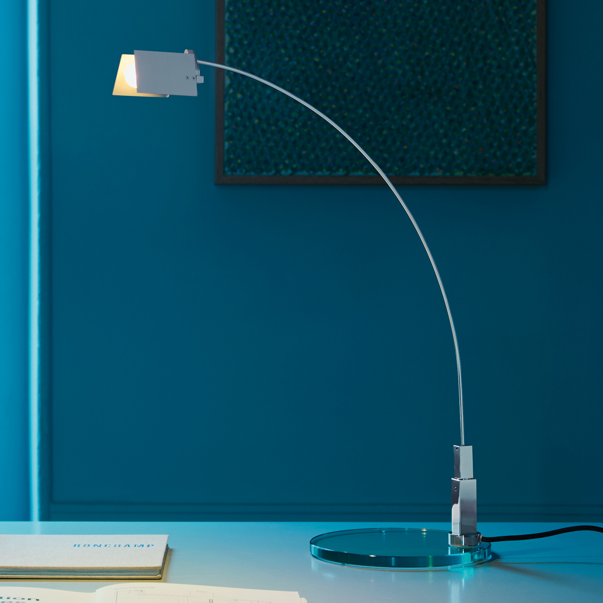 Zusätzliche Flexibilität erhält die Falena Tischleuchte aufgrund ihres um 360° drehbaren Leuchtenkörpers. Dieser besteht aus einem glanzvoll verchromten Leuchtenarm und einer kreisrunden Basis aus geschliffenem Floatglas. Die elektronische Verbindung zwischen Basis und Korpus erfolgt durch eine Einschaltklinke. Über einen auf dem Netzkabel befindlichen Schalter wird die Fontana Arte Falena Leuchte bedient.