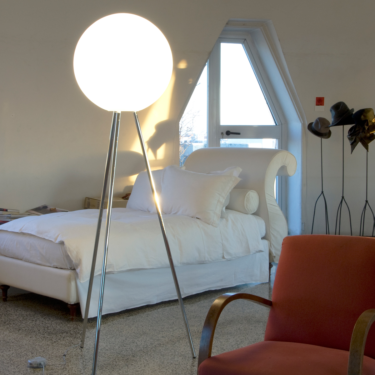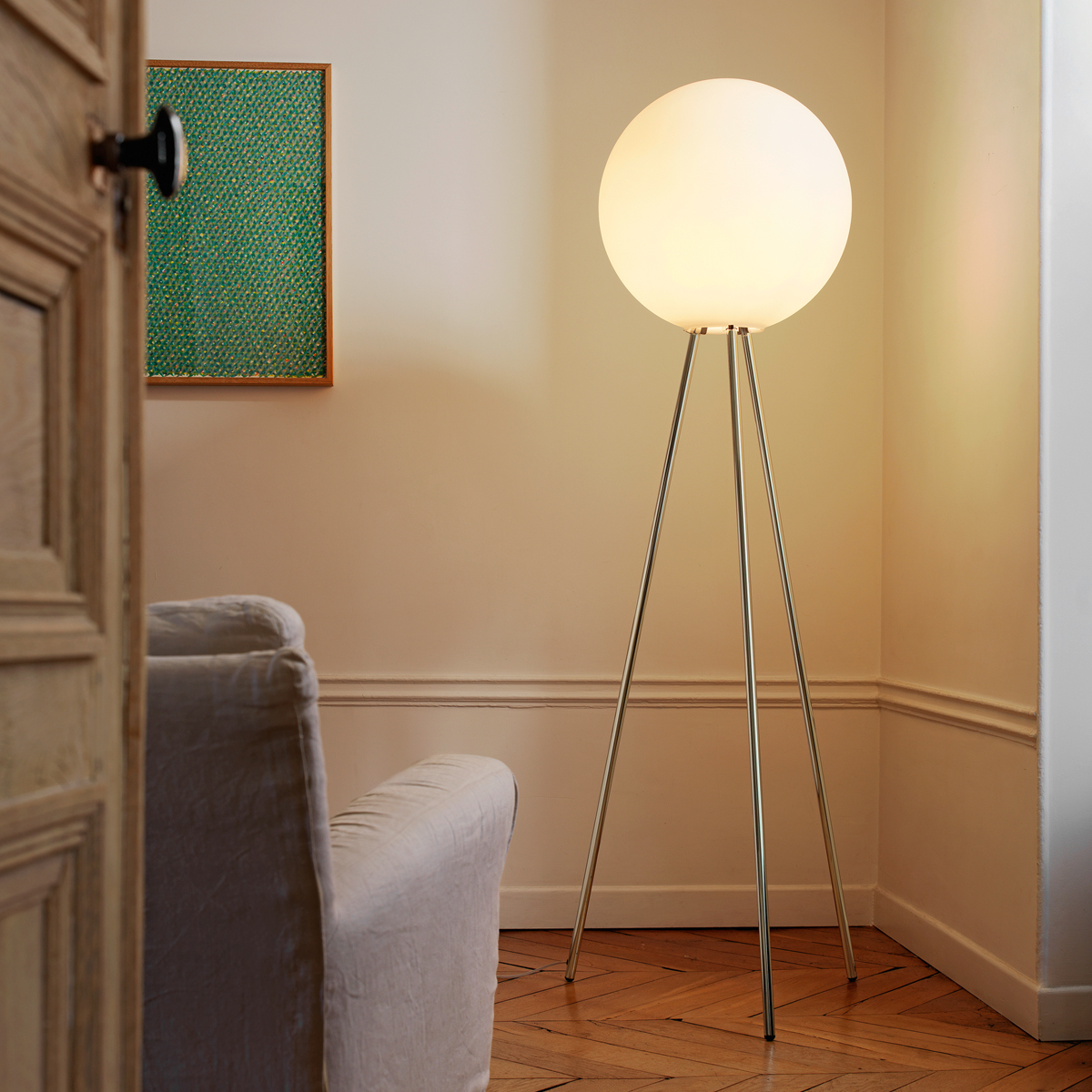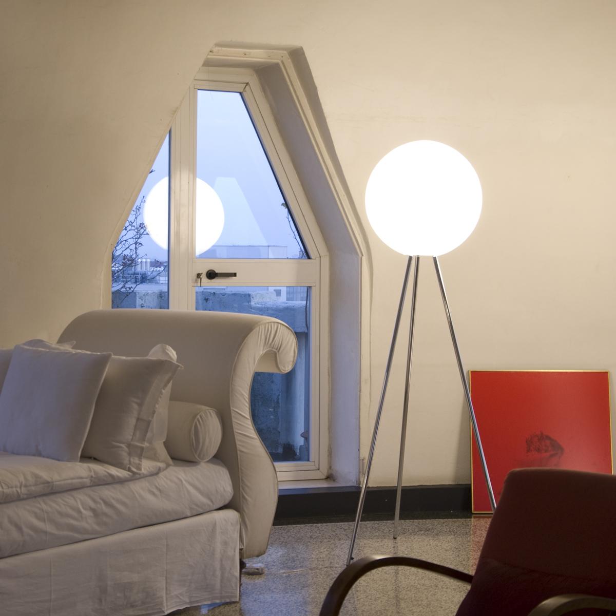 Eine Sphäre aus Licht, rein und unverziert. Diesem Konzept folgt das Design der von Daniela Puppa entworfenen Prima Signora Stehleuchte. Ihr kugelförmiger Leuchtenschirm besteht aus mundgeblasenem Glas, dessen opalweiße Oberfläche eine gleichmäßige Lichtausstrahlung generiert. Als Sockel dient ein Dreifuß aus verchromtem Metall, dessen feine Linien den schwebenden Charakter des Diffusors noch betonen.