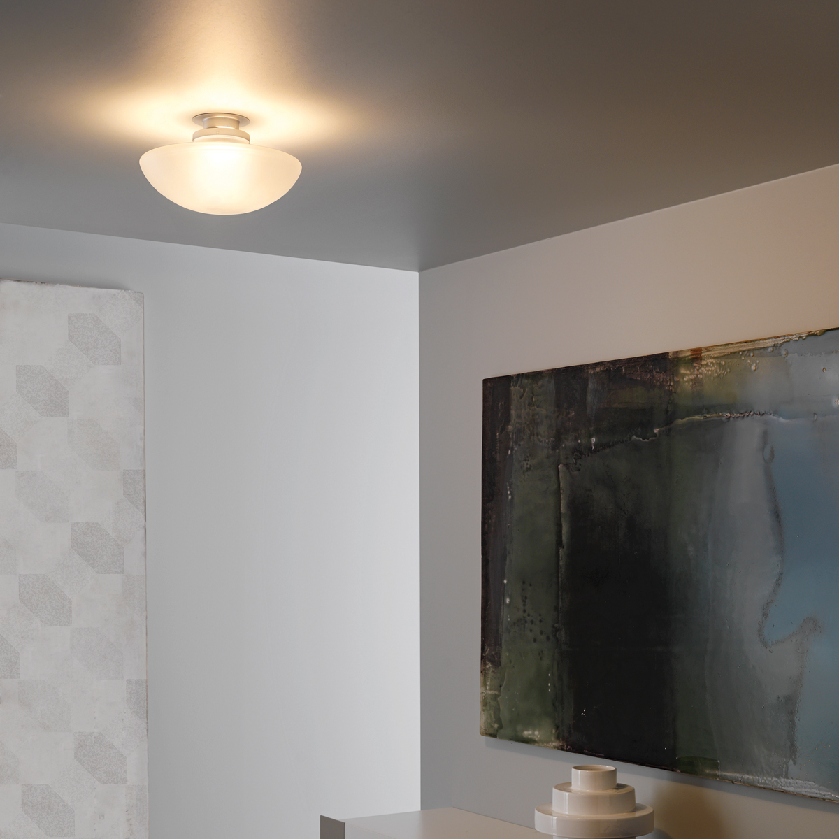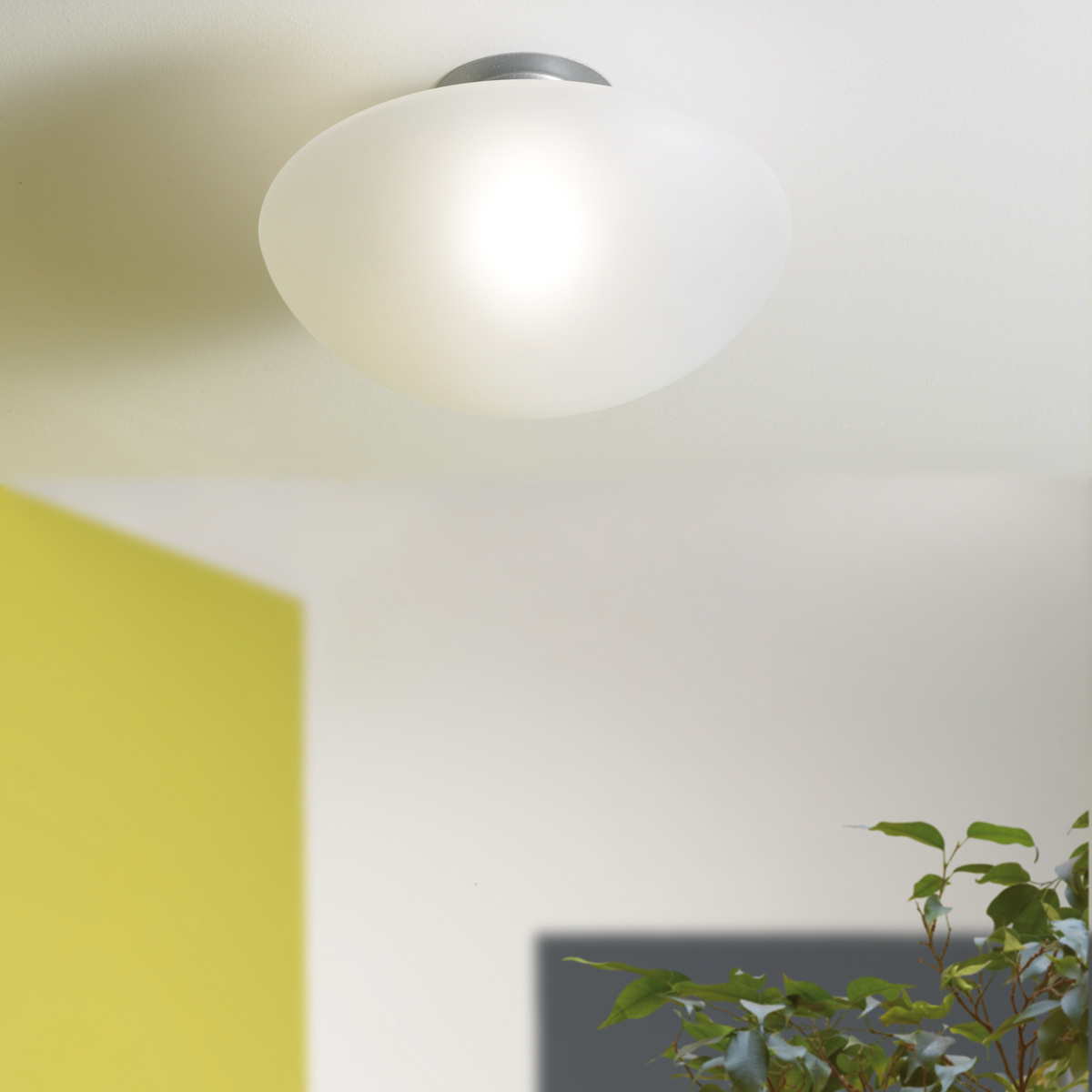 Eine harmonische Linie und diskrete Gestaltung bestimmen den Leuchtenkorpus der Sillabone. Die größere Version der Fontana Arte Sillaba Leuchtenfamilie eignet sich zur Installation als Wand- oder Deckenleuchte und gliedert sich ihrer Umgebung harmonisch ein. Für ein angenehm helles, rundum diffus gestreutes Licht sorgt der sanft geschwungene Schirm aus sandgestrahltem, weißem Glas.