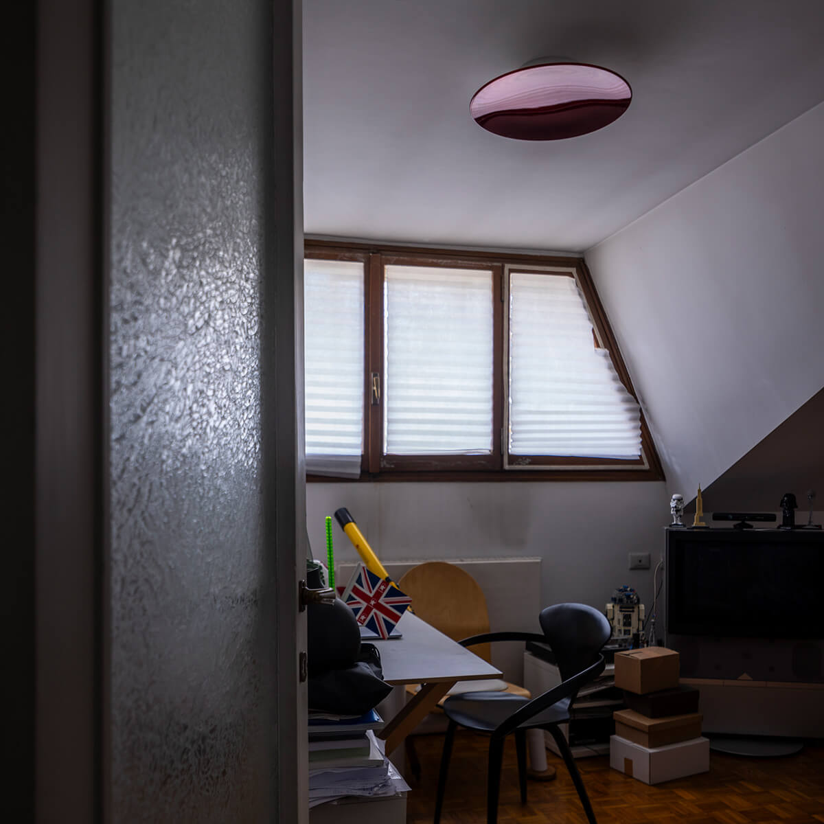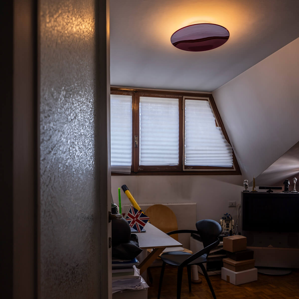 Die Lichtquelle bleibt im Hintergrund: Ein LED-Zylinder, verborgen hinter der schwebend wirkenden Aluminiumfläche, erzeugt eine weiche, gleichmäßige Lichtaura, die blendfrei auf Wand oder Decke strahlt. So entsteht ein stimmungsvolles, indirektes Licht, das Innenräume subtil auflädt – perfekt für Wohnzimmer, Hotel-Lounges, Flure oder Repräsentationsflächen. Die Lichtwirkung erinnert an eine sanfte Sonnenfinsternis: visuell eindrucksvoll, technisch ausgereift.