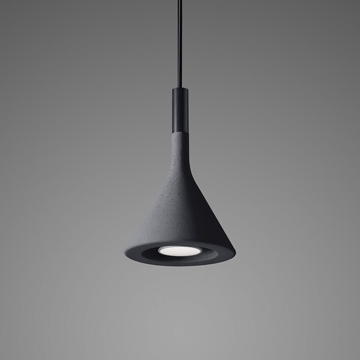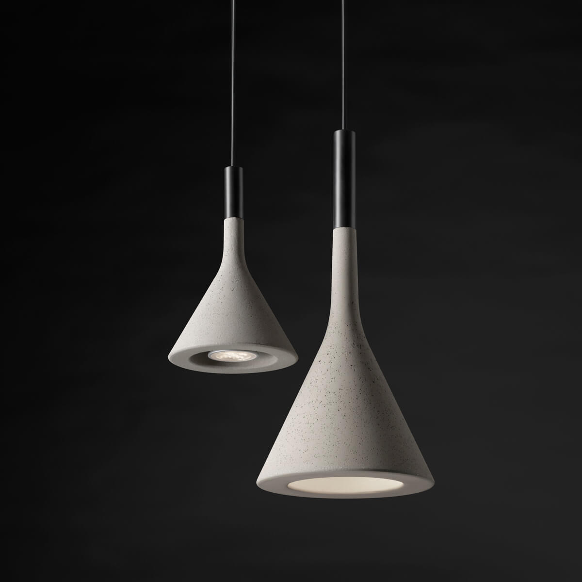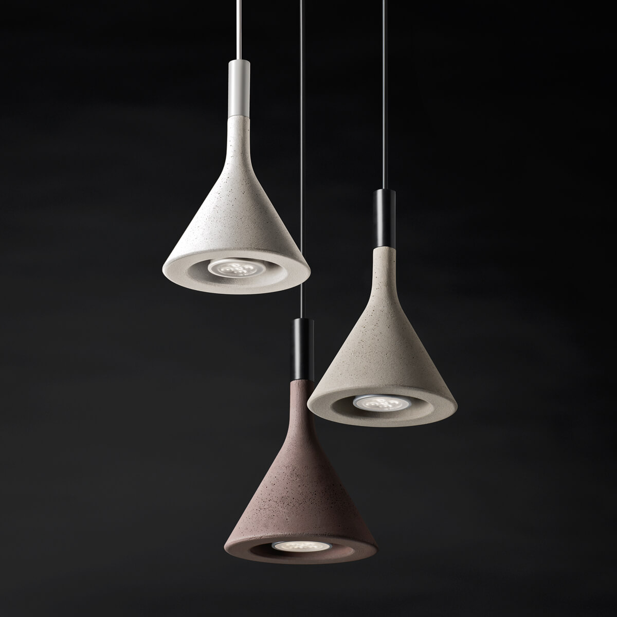 Die Foscarini Aplomb Mini Pendelleuchte ist in vier unterschiedlichen Tönen erhältlich, die perfekt mit der rustikal anmutenden Optik des Betons harmonieren. In den Ausführungen Zementgrau, Weiß und Braun ist der Aluminiumkragen zwischen Zementleuchtenkörper und Kabel schwarz ausgeführt. In der Variante Anthrazitgrau ist der Kragen hingegen ebenfalls anthrazitfarben gehalten. Die weiße Version verfügt über ein weißes Leuchtenkabel.