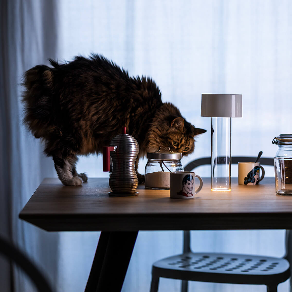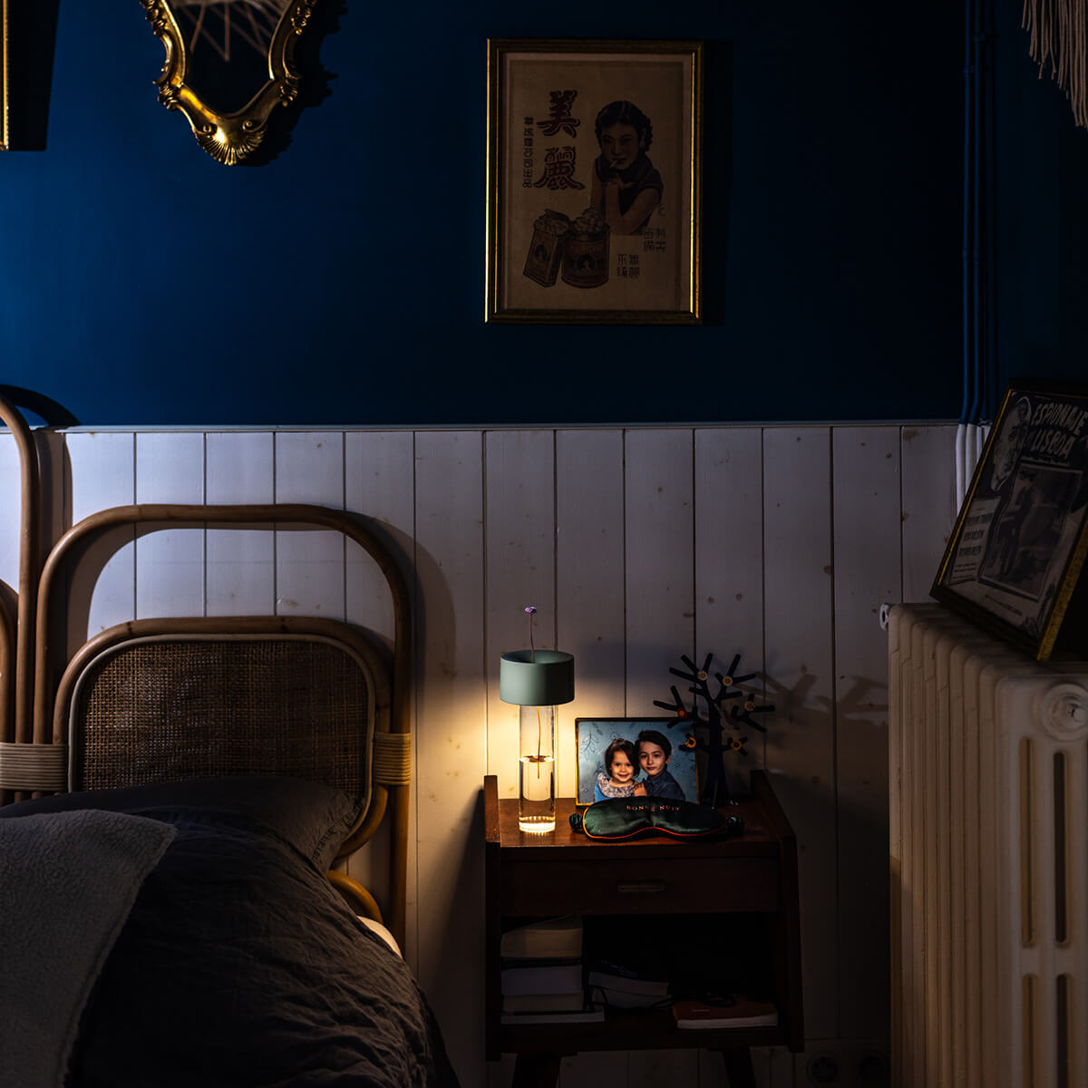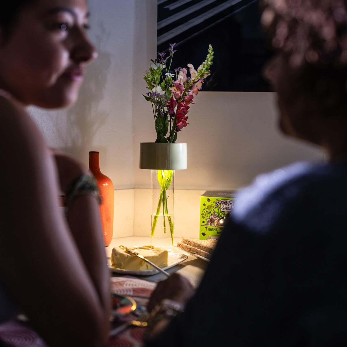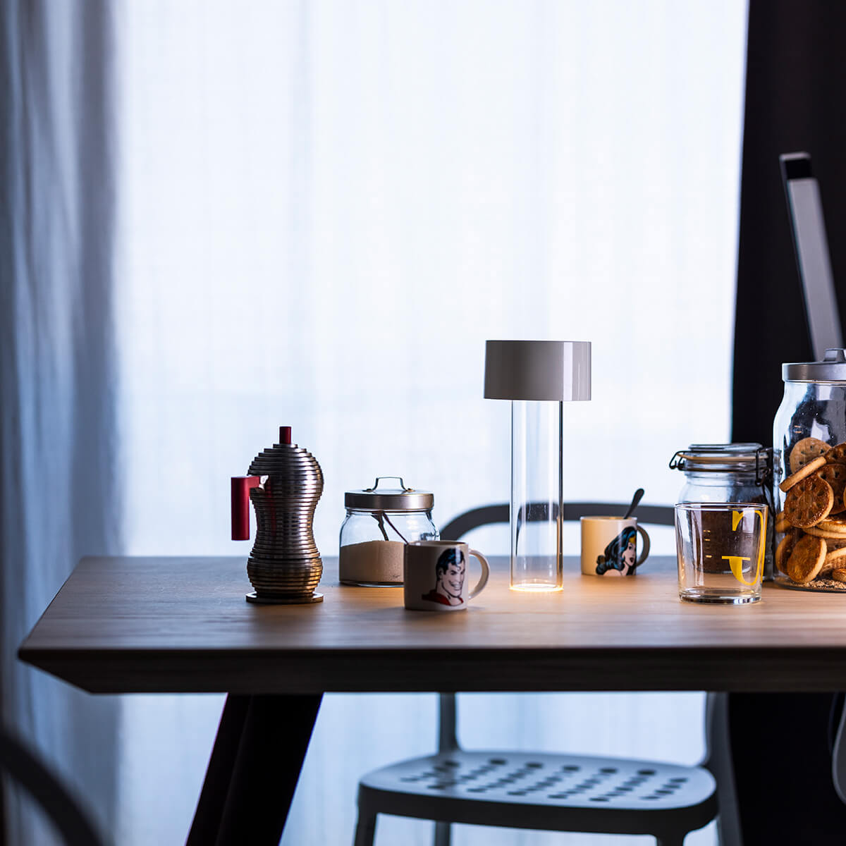 Die Fleur LED Tavolo beleuchtet nicht nur den unmittelbaren Bereich um ihren Fuß, sondern erzeugt auch ein breit gestreutes Licht auf der Fläche, auf der sie steht – sei es ein Tisch, eine Kommode oder ein Sideboard. Für den besonderen Lichteffekt sorgt ein speziell entwickelter LED-Ring, der trotz seiner miniaturisierten Komponenten eine breitere Lichtdiffusion als andere Akkuleuchten erzeugt. Über einen dezenten Touchdimmer, der sich unterhalb des Schirms neben dem Ladeanschluss befindet, lässt sich die Fleur in drei Stufen dimmen (30/70/100 %)