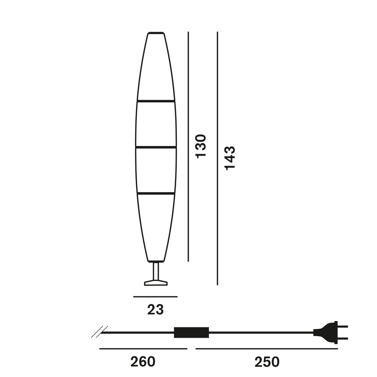 Während sich die Leuchtenschirme der für den Innenraum gestalteten Foscarini Havana Terra Stehleuchten durch eine in vier Segmente unterteilte Form auszeichnen, wurde bei der Konzeption der Havana Outdoor Terra Bassa auf eine solche Zerlegung verzichtet und der aus gepresstem Polyethylen gefertigte Schirm als ein durchgängiger, lediglich durch zarte Einmuldungen gegliederter Körper kreiert. Auf diese Weise ist die Außenstehleuchte wetterfest.