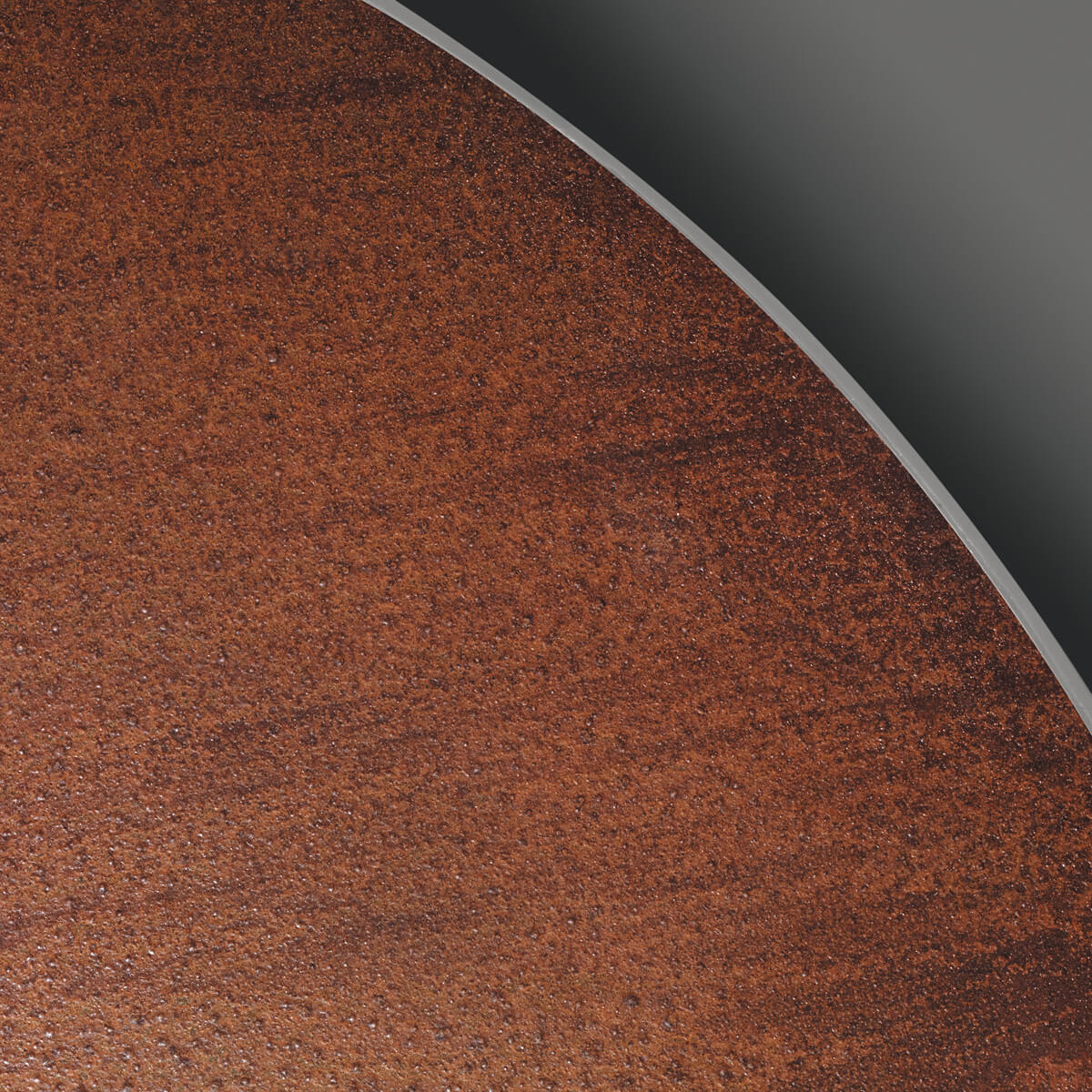 Die Foscarini Solar Outdoor Terra Bodenleuchte besteht aus einem halbrund geformten Unterbau aus unzerbrechlichem, wasserfestem Polyethylen und einer runden Abstellfläche aus braun texturisiertem Feinsteinzeug. Damit das Regenwasser abfließen kann, bildet die Ablagefläche eine flache und bündig zum äußeren Rand verlaufende Ebene.