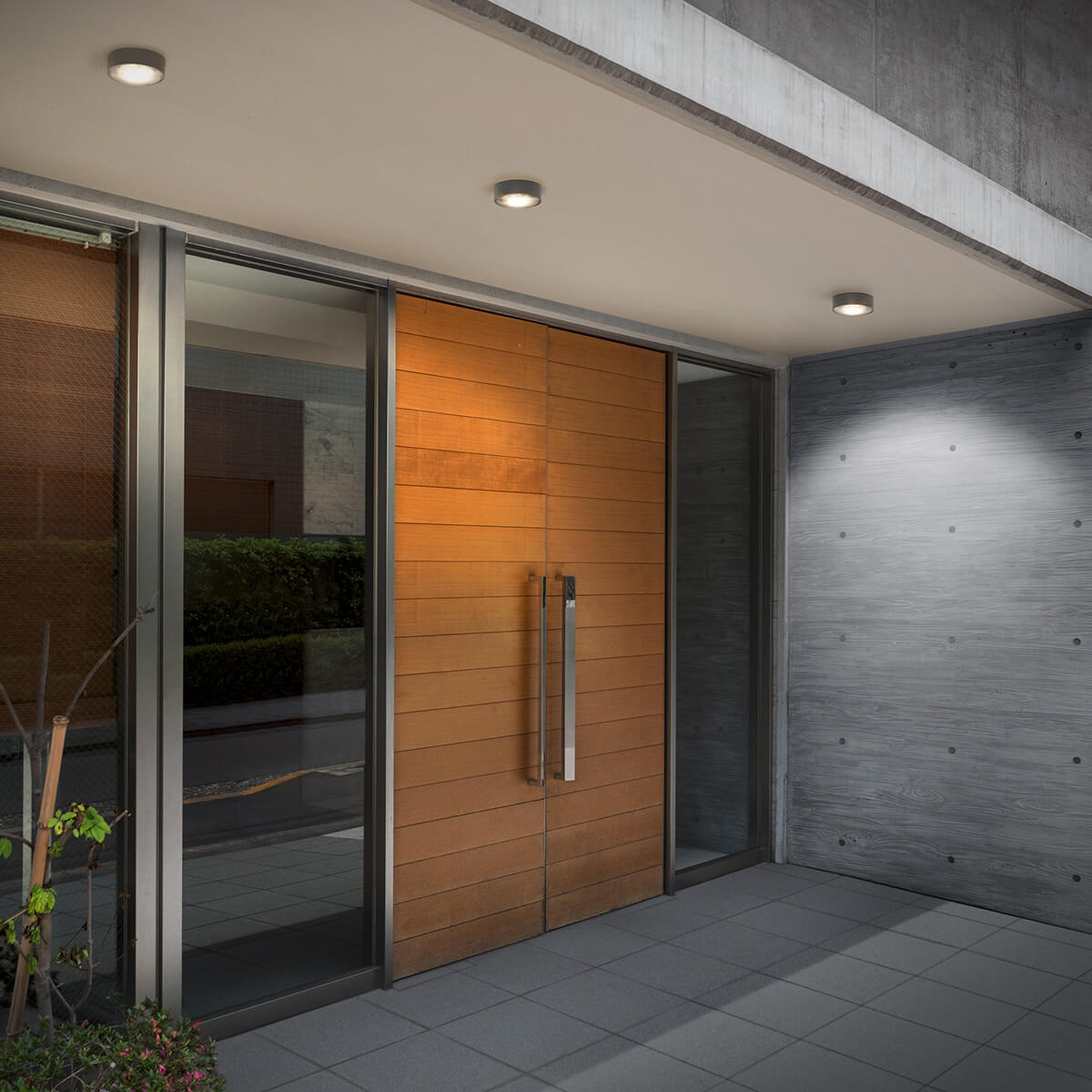 - Moderne LED Außendeckenleuchte aus hochwertigem Aluminium-Guss mit einer Glaslinse für einen direkten Lichtaustritt nach unten