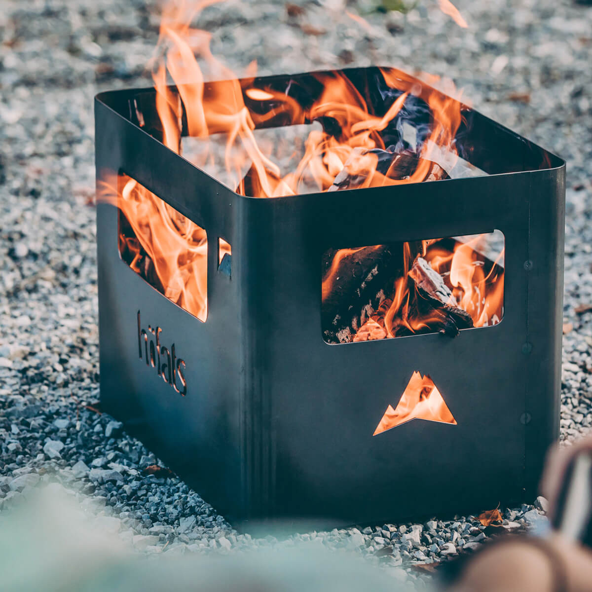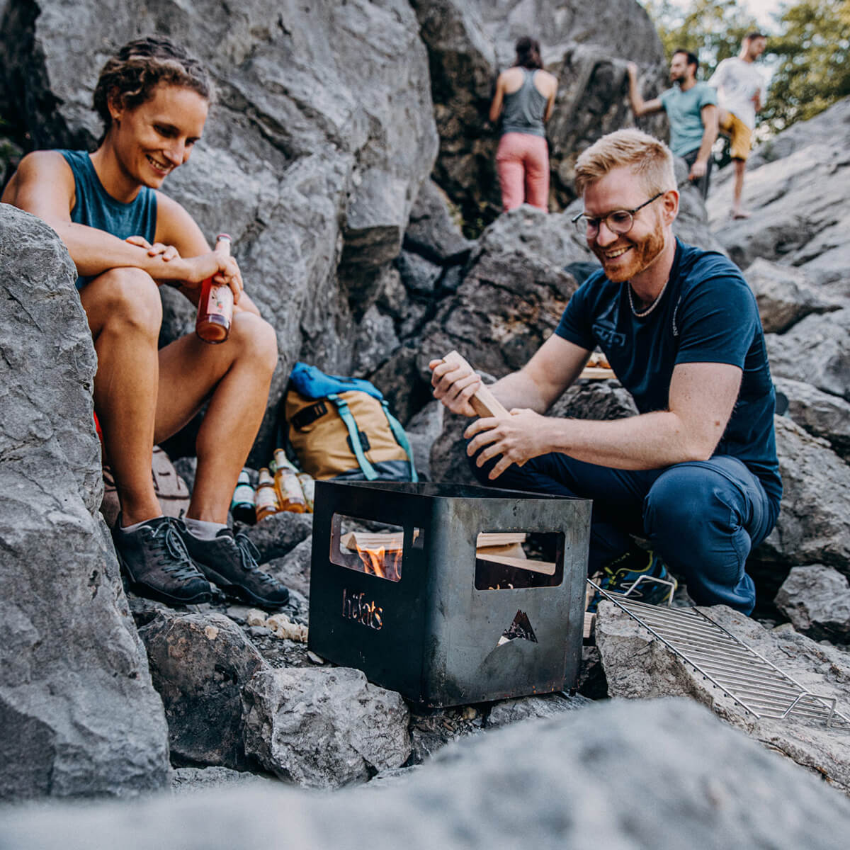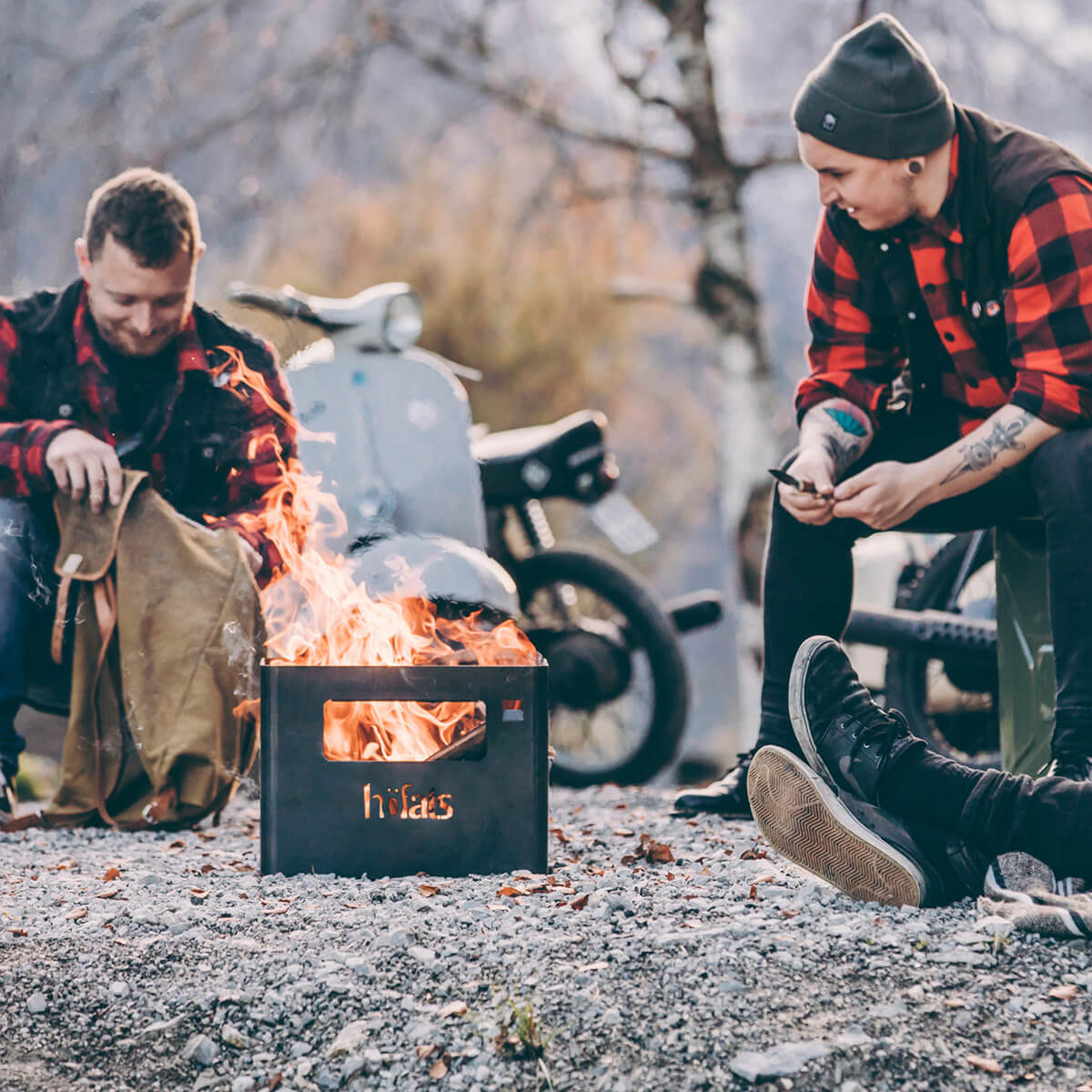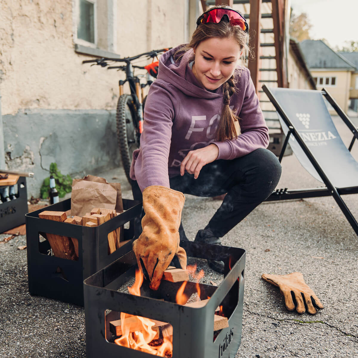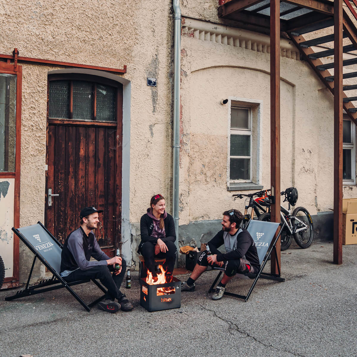 Die Beer Box ist ein echtes Multitalent. Feuerholz einlegen, anzünden – und schon hat man eine offene Feuerstelle. Das Kartoninnenleben kann im Notfall als Anzündhilfe genutzt werden. Und dank optionalem Zubehör wie Grillrost und Holzbrett lässt sich die Kiste im Handumdrehen in einen Grill, Hocker oder Beistelltisch verwandeln.