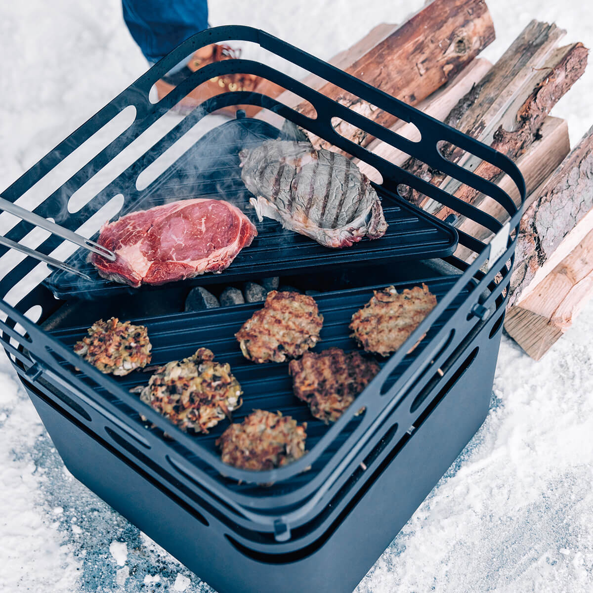 Neben der glatten Fläche hat die höfats Cube Gussplatte auch eine geriffelte Seite, um jedes Steak mit dem perfekten Branding zu versehen. Zwei Platten können gleichzeitig in einem Cube Feuerkorb verwendet werden – bei Bedarf auch auf unterschiedlichen Höhen platziert.