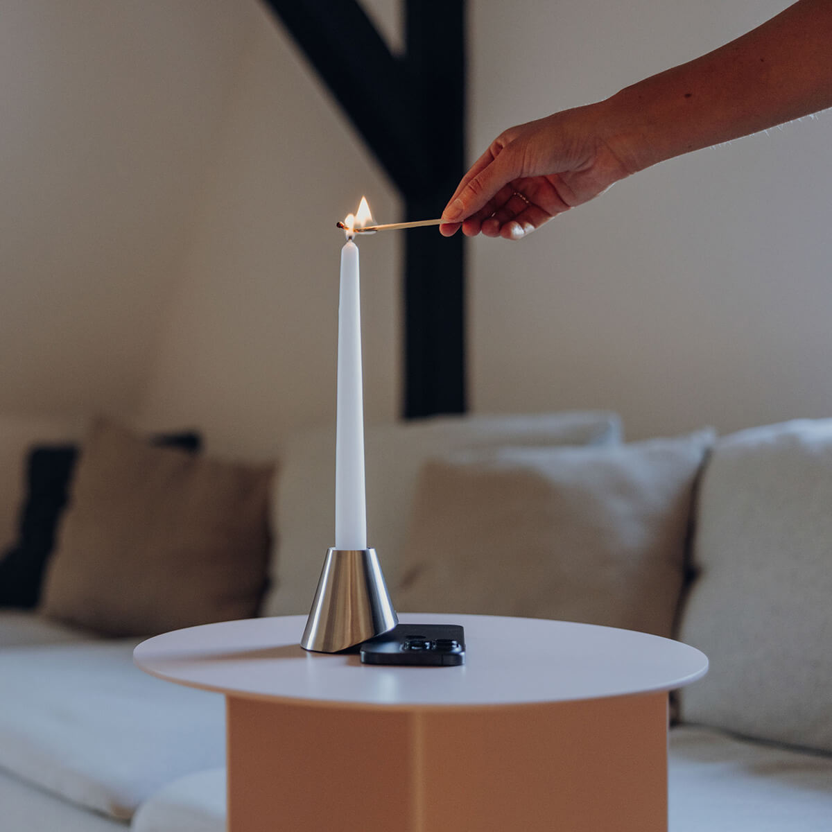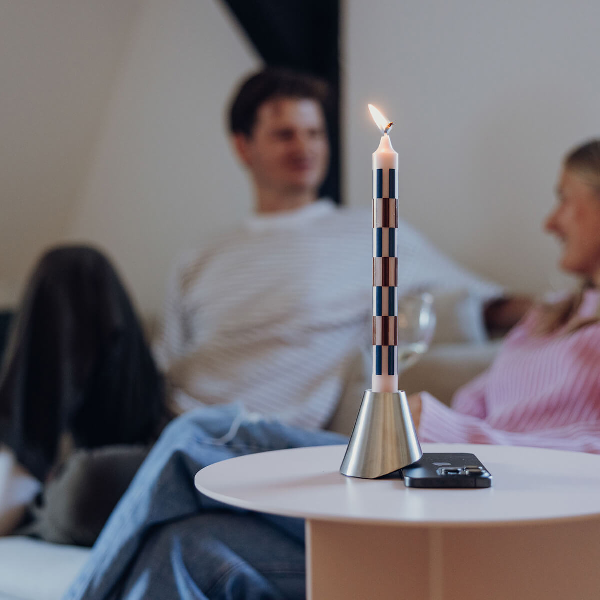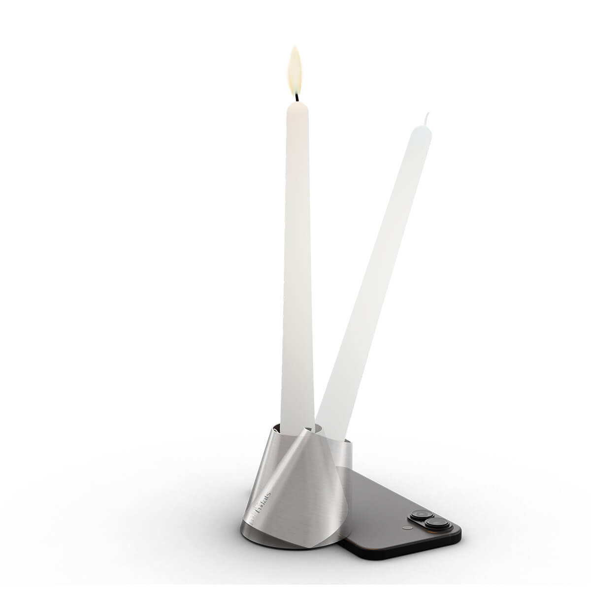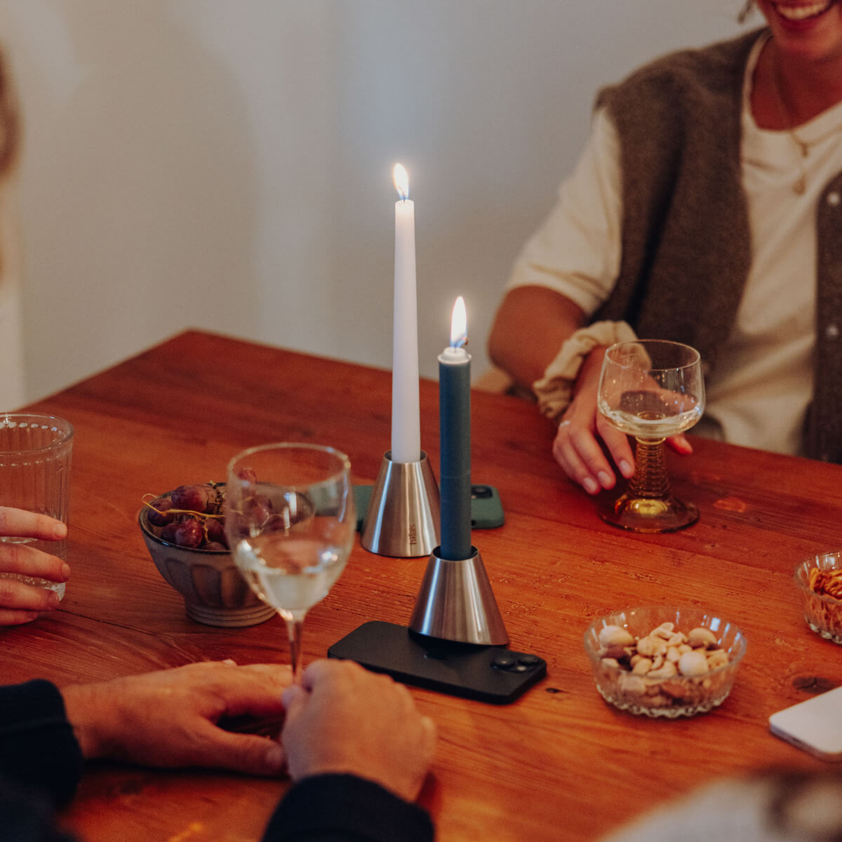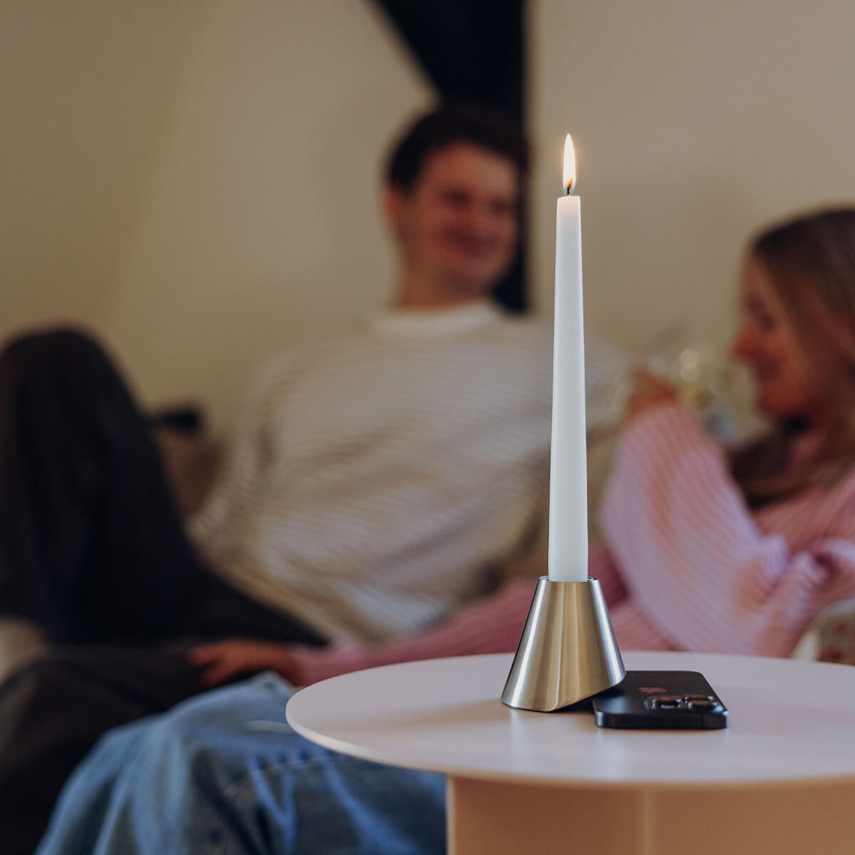 Von Natur aus leicht schräg konstruiert, richtet sich der Kerzenhalter auf, sobald ein Smartphone unter ihn geschoben wird. So verwandelt er digitale Ablenkung in ein Signal für Nähe, Blickkontakt und echte Gespräche. Der sanfte Schein einer Kerze sorgt für Wärme und Behaglichkeit – eine Atmosphäre, in der Menschen wieder ins Gespräch kommen, lachen, zuhören und diskutieren.