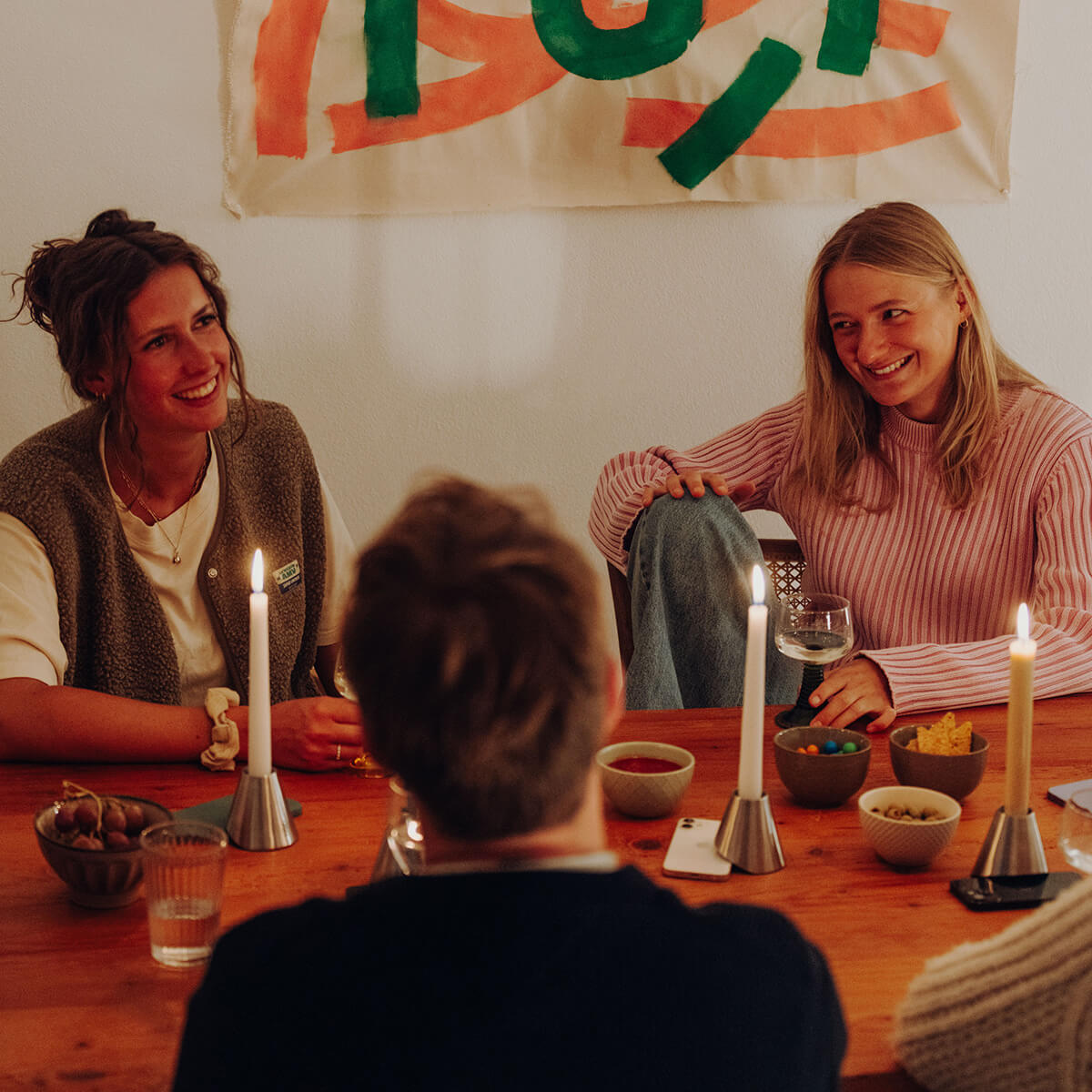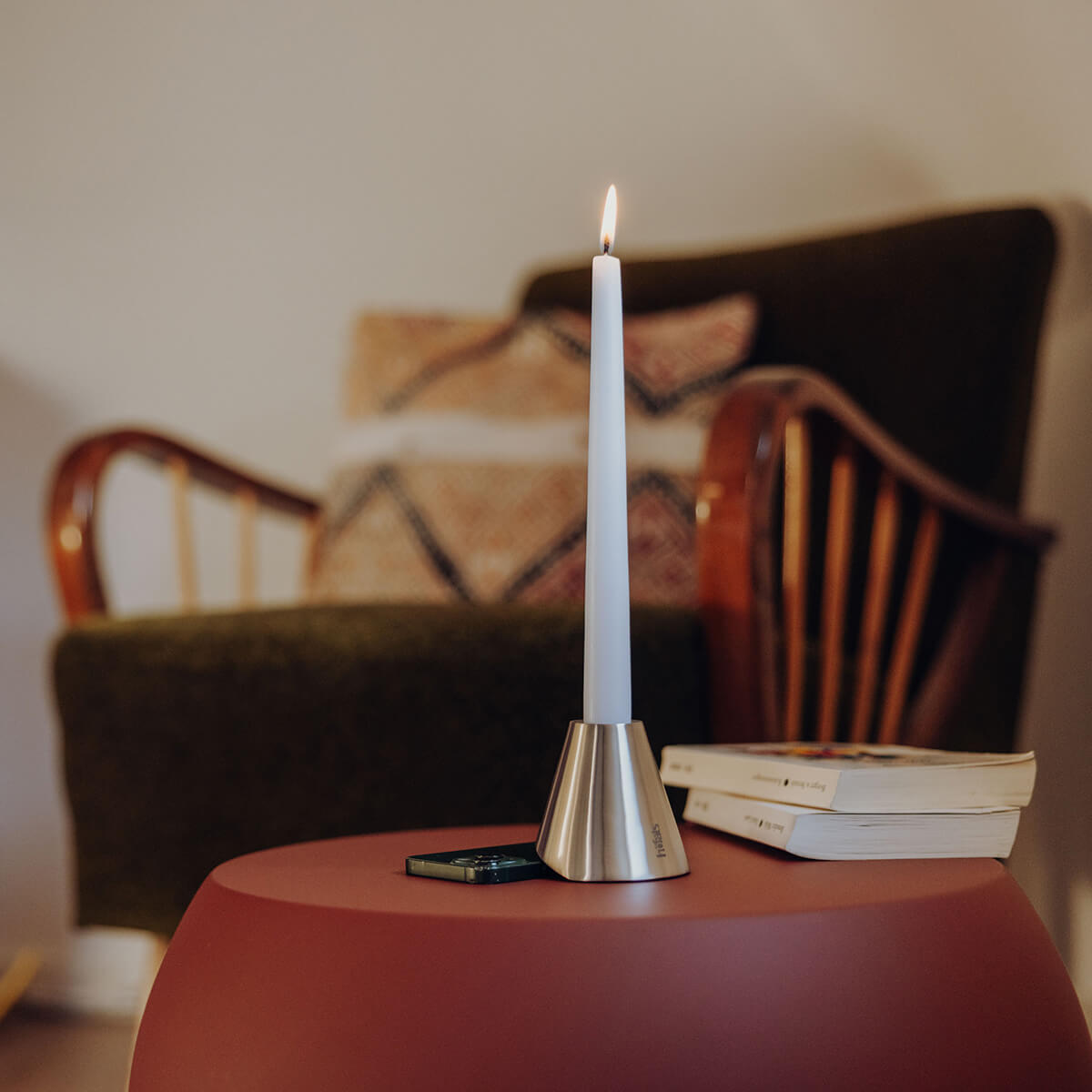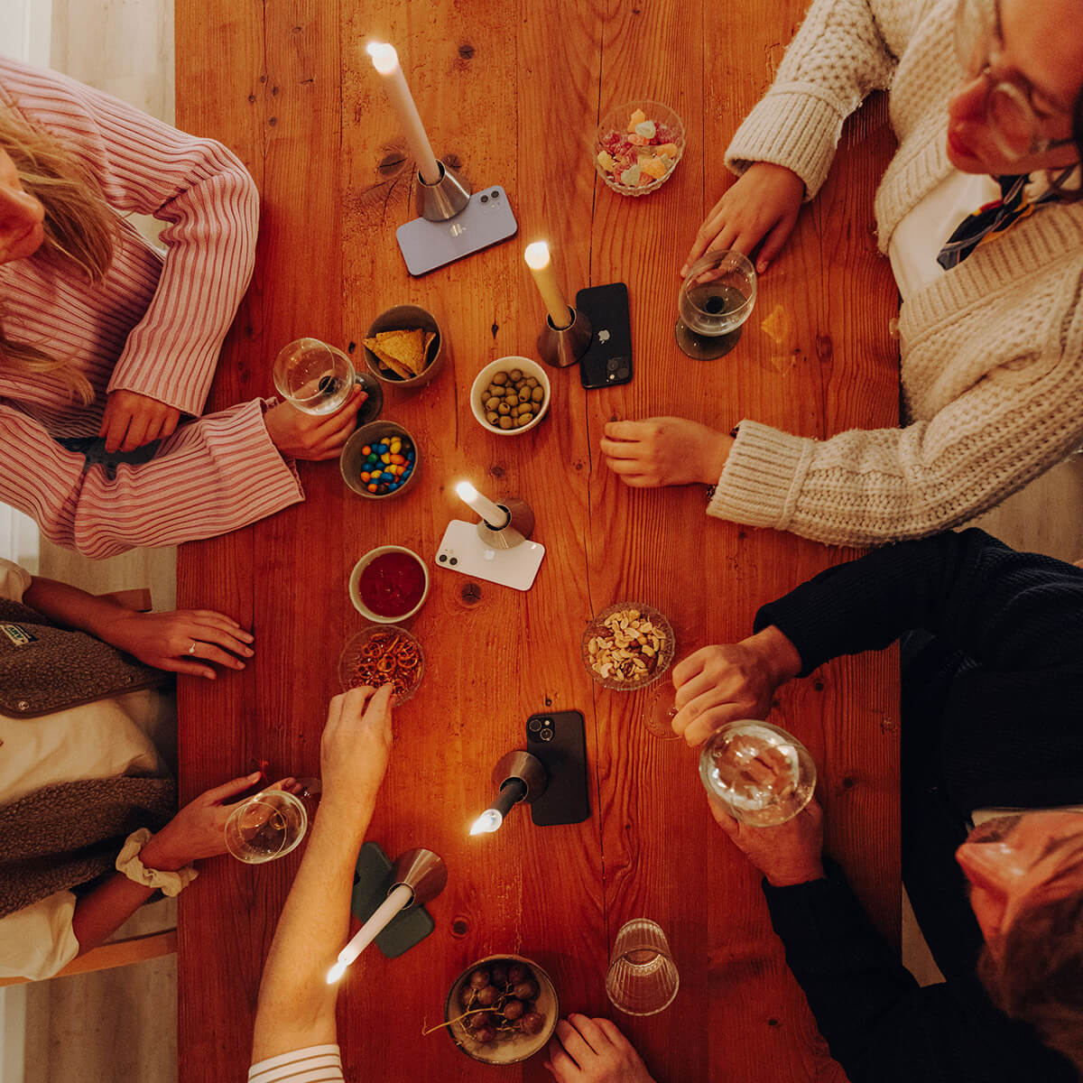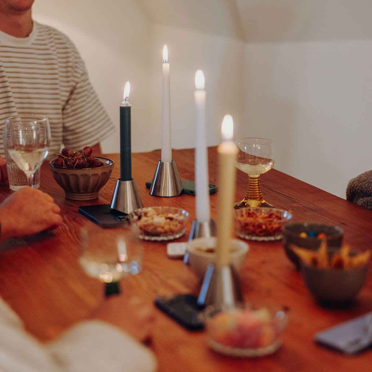 Von Natur aus leicht schräg konstruiert, richtet sich der Kerzenhalter auf, sobald ein Smartphone unter ihn geschoben wird. So verwandelt er digitale Ablenkung in ein Signal für Nähe, Blickkontakt und echte Gespräche. Der sanfte Schein einer Kerze sorgt für Wärme und Behaglichkeit – eine Atmosphäre, in der Menschen wieder ins Gespräch kommen, lachen, zuhören und diskutieren.