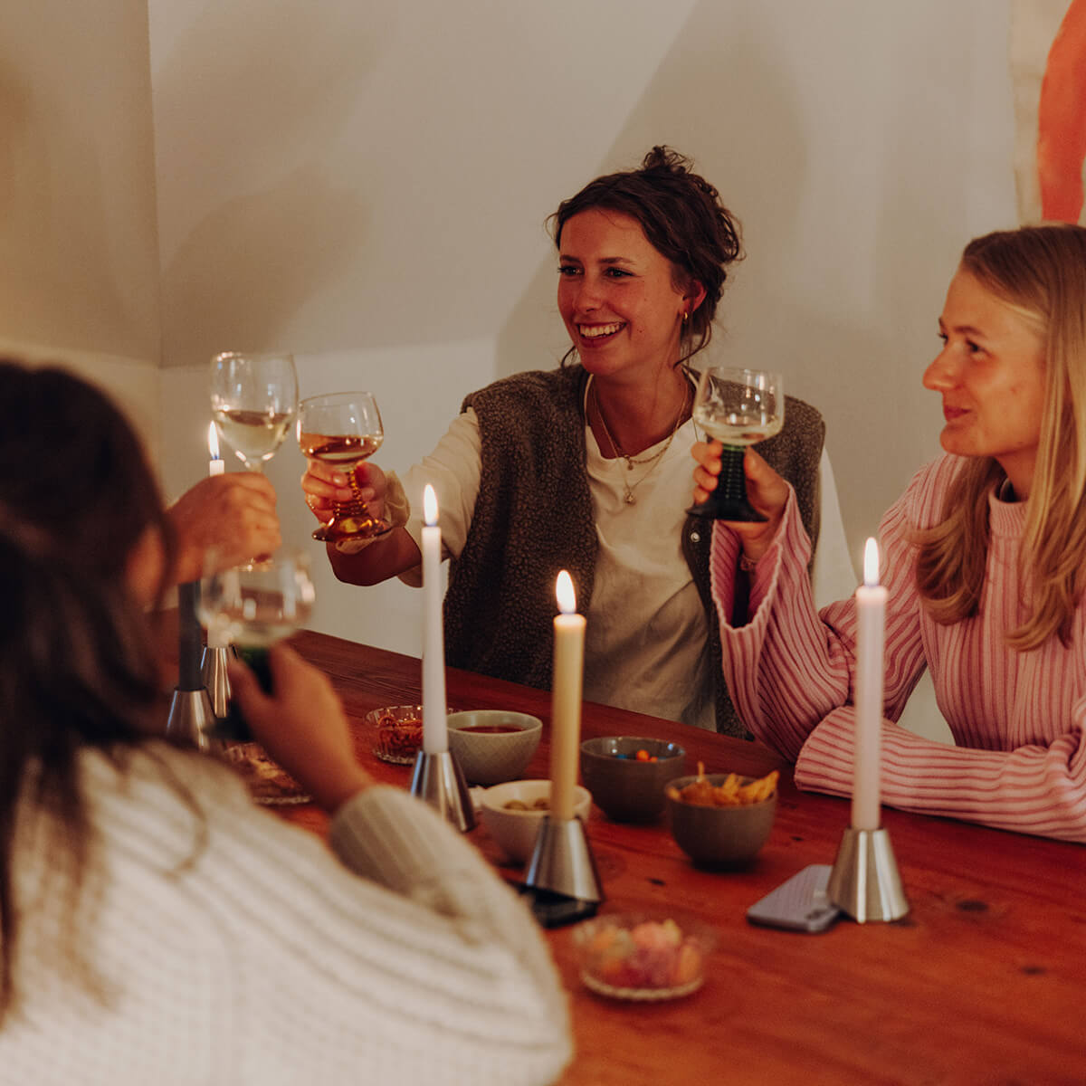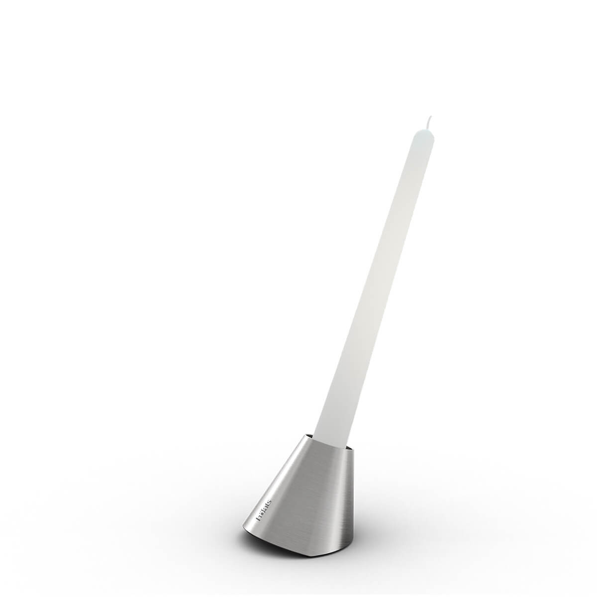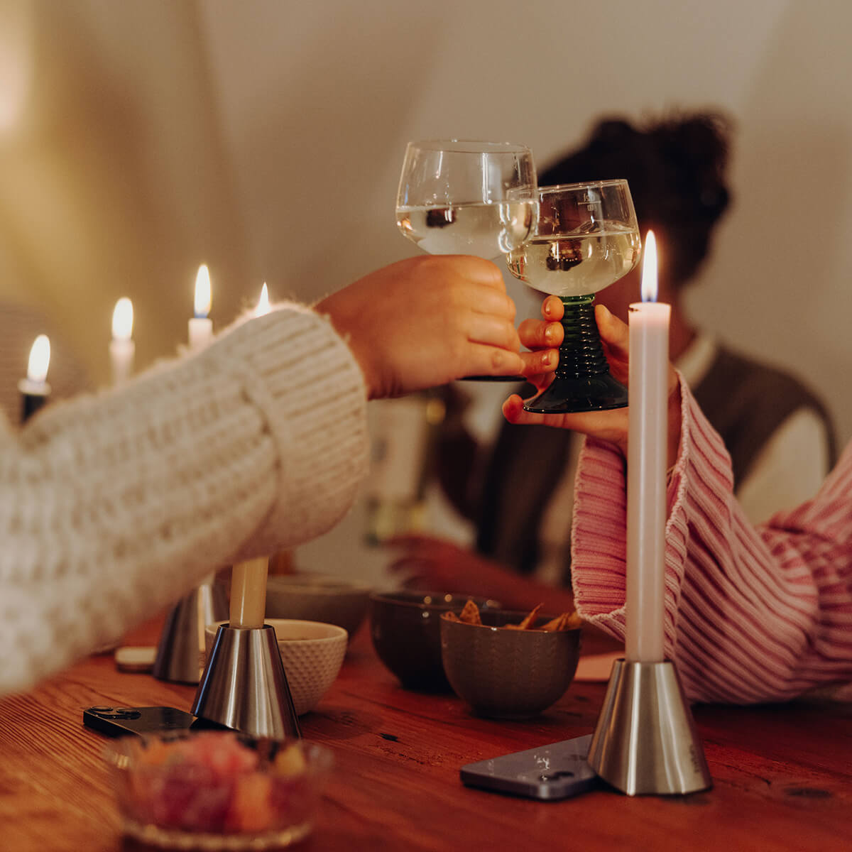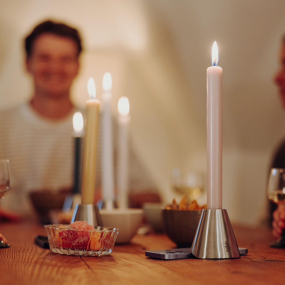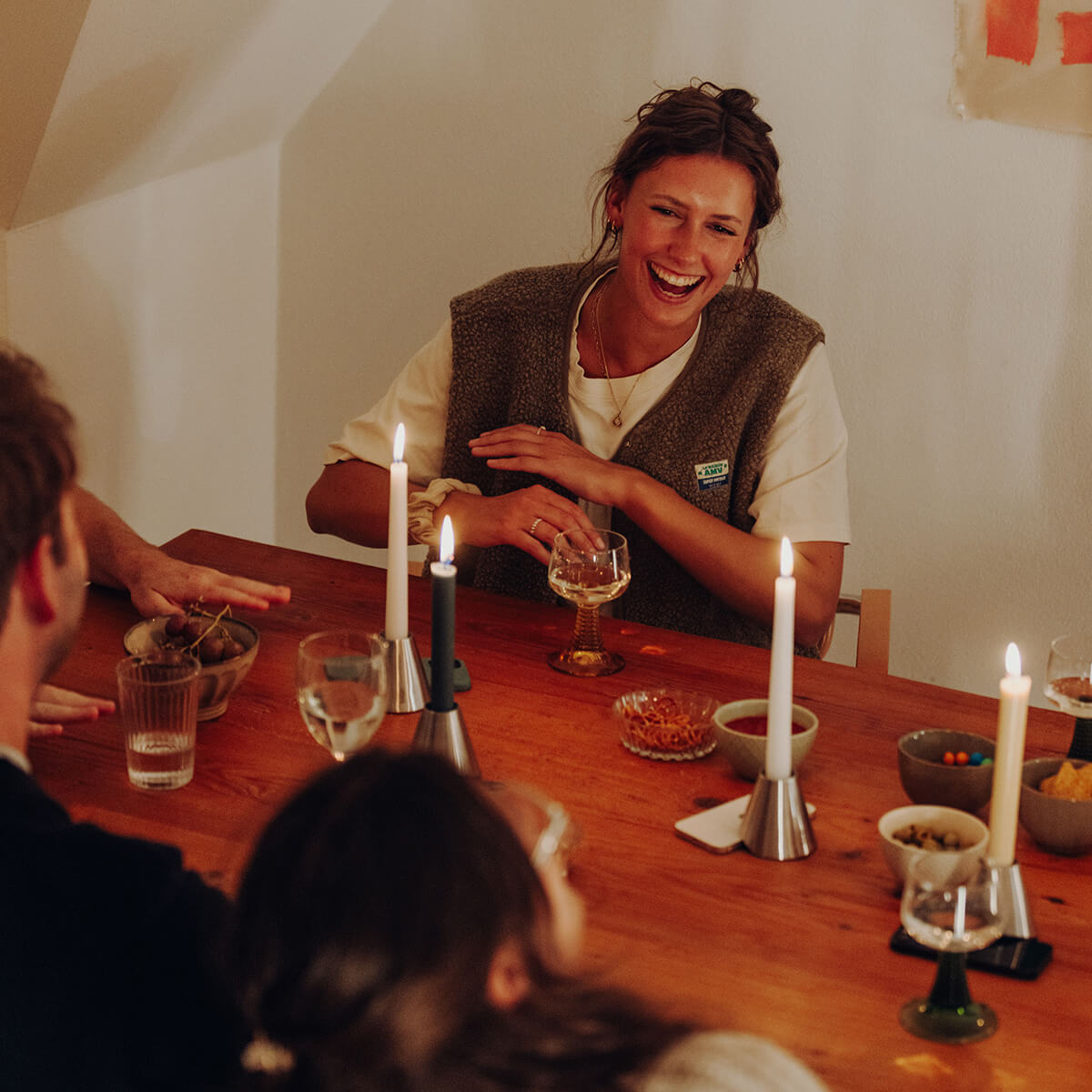 Von Natur aus leicht schräg konstruiert, richtet sich der Kerzenhalter auf, sobald ein Smartphone unter ihn geschoben wird. So verwandelt er digitale Ablenkung in ein Signal für Nähe, Blickkontakt und echte Gespräche. Der sanfte Schein einer Kerze sorgt für Wärme und Behaglichkeit – eine Atmosphäre, in der Menschen wieder ins Gespräch kommen, lachen, zuhören und diskutieren.