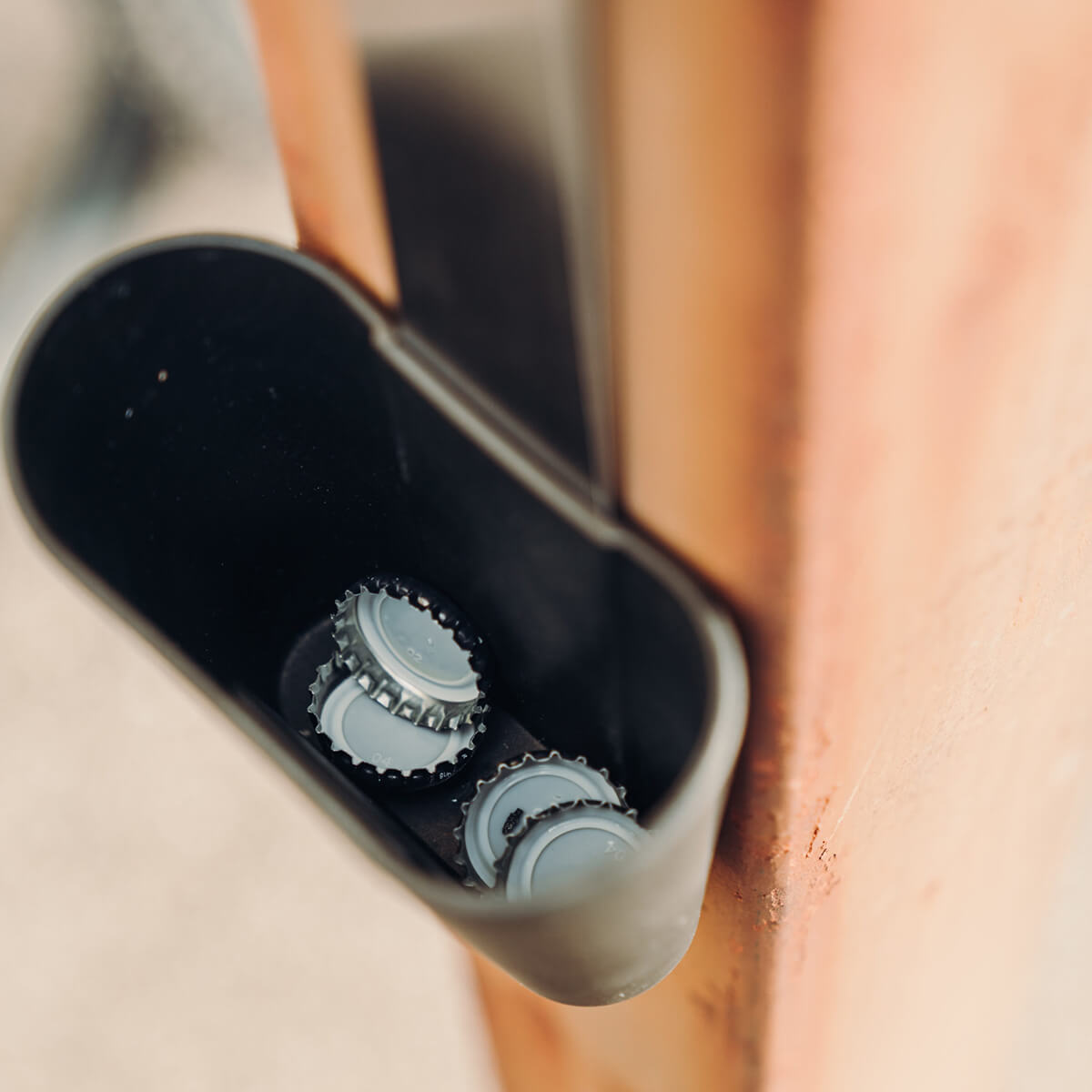 - Der abnehmbare Becher fängt ca. 60 Kronkorken