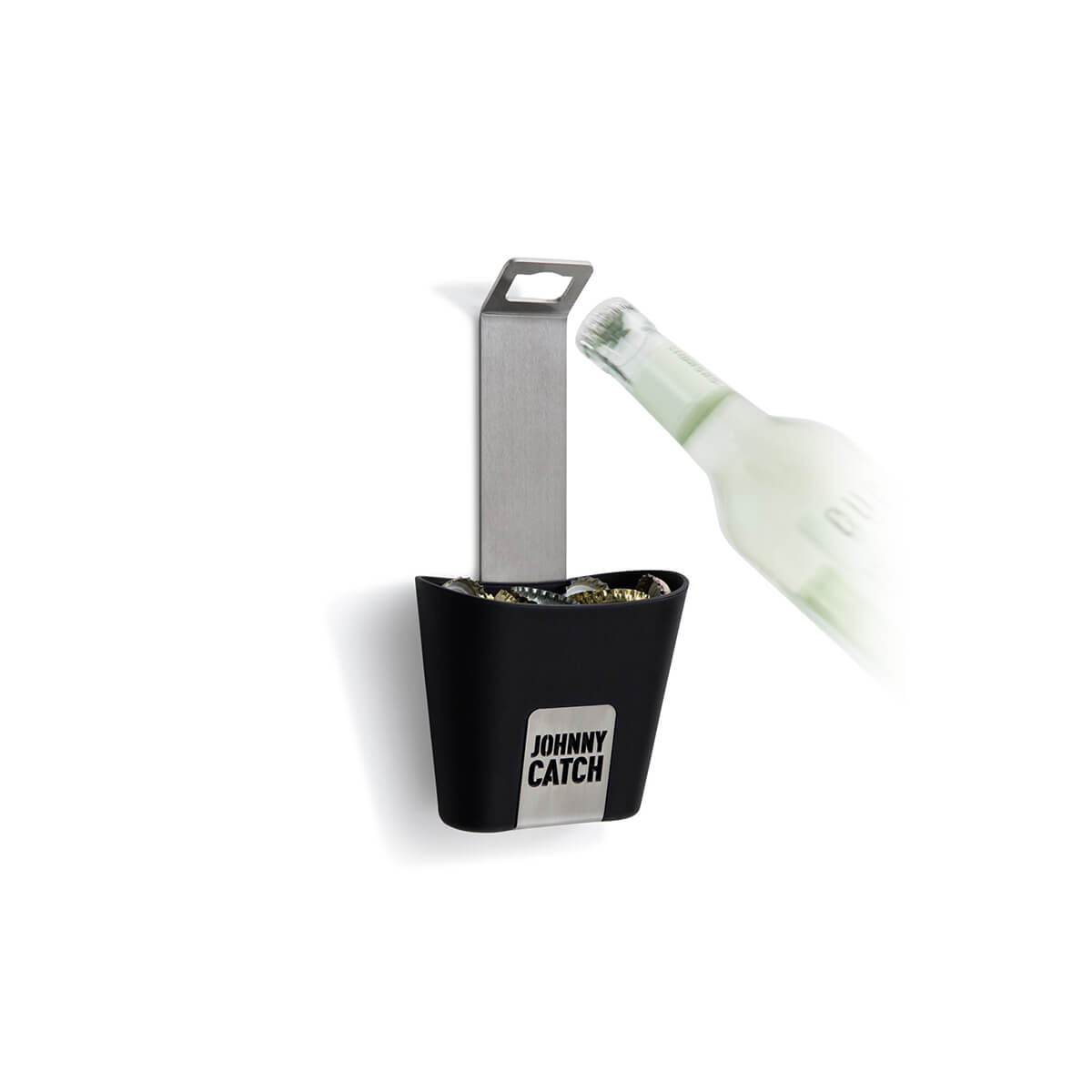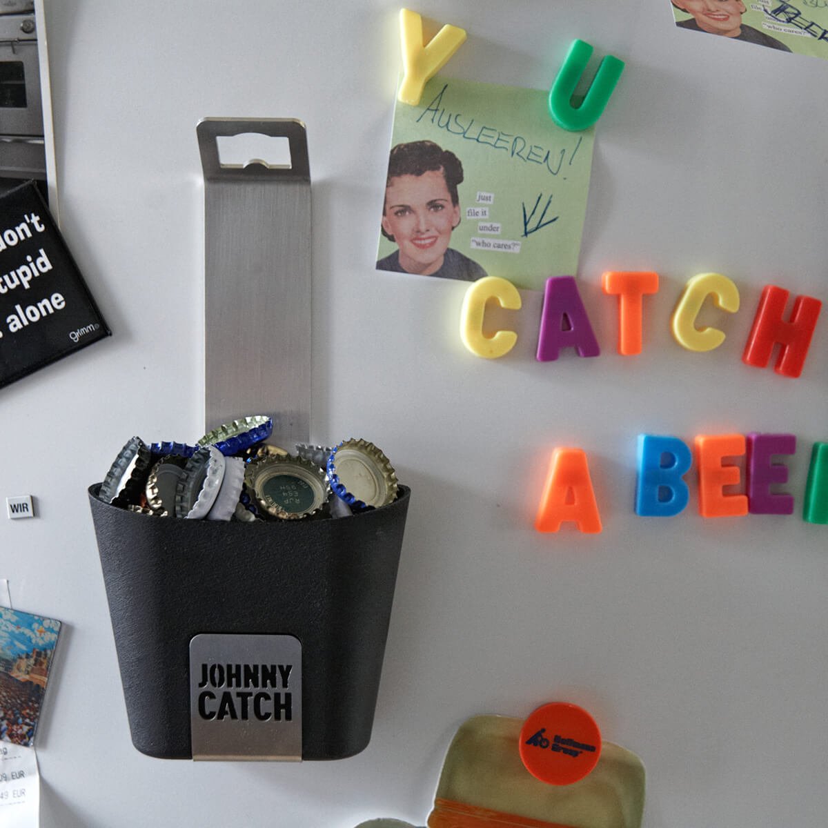 Johnny Catch Cup ist ein echter Schluckspecht. Der coole Flaschenöffner "schluckt" bis zu 60 Kronkorken. Flasche auf und zack! Schon landet der Kronkorken im praktischen Auffangbecher. Ist der Becher voll, lässt er sich einfach abnehmen und ausleeren. Und die Party kann weitergehen!