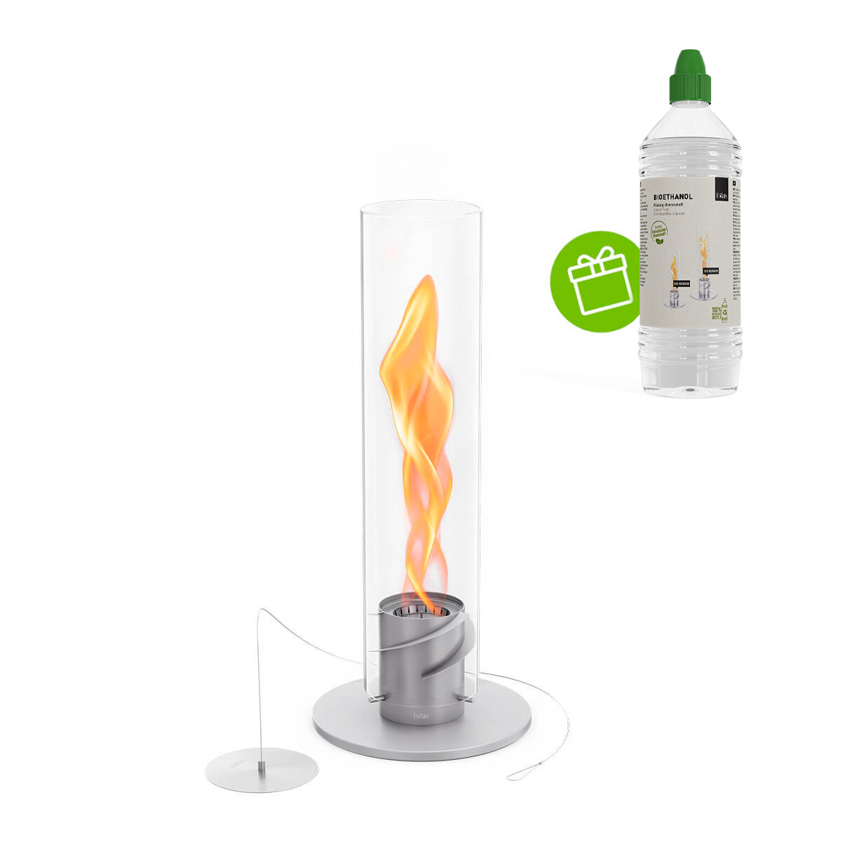 Wie funktioniert das höfats Spin 900 Tischfeuer? Der skulpturale Feuerwirbel basiert auf einer ausgeklügelten Technik: Sobald das höfats Bioethanol entzündet und der hitzeresistente Borosilikatglaszylinder aufgesetzt wird, bringt der Luftstrom die Flammen durch drei rotierende Flügel in Bewegung. Diese Rotation, verstärkt durch die eigene Thermik und den Kamineffekt des Glases, intensiviert die spiralförmige Flammensäule. Dass die erzeugte Flamme auch bei Tageslicht hell und markant erscheint, garantiert der patentierte Bio-Burner mit seiner ausgeklügelten Brennertechnologie.