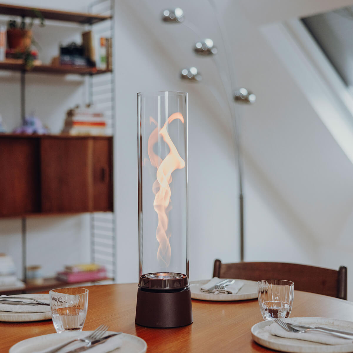 Die Spin air 1200 ist in sechs stilvollen Farben erhältlich, darunter samtig matte Töne wie Creme, Sand, Rostbraun oder Schwarz. Für besonders wohnliche Akzente steht ein Modell mit Sockel aus Eichenholz zur Verfügung. Eine Variante im All-Black-Look mit schwarz getöntem Glaszylinder setzt ein modernes, ausdrucksstarkes Statement und intensiviert das Flammenspiel.