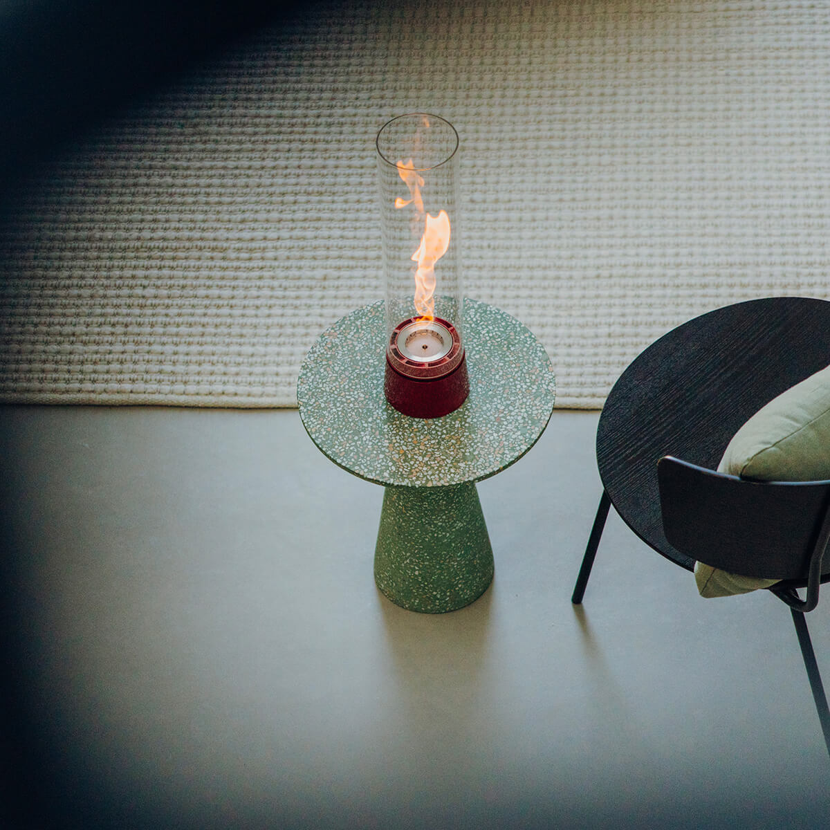 Im Inneren sorgt der patentierte höfats Bio-Burner für das charakteristische, dynamische Flammenbild. Die Flamme rotiert sichtbar im Glaszylinder und erzeugt ein spektakuläres Lichtspiel. Zum Betrieb des Tischfeuers empfehlen wir den als Zubehör verfügbaren höfats Bioethanol Flüssig-Brennstoff – einen nachhaltigen, zu 100 % biologischen Brennstoff, der rauch-, ruß- und geruchsfrei verbrennt. Damit eignet sich die Spin air sowohl für Innenräume als auch den Außenbereich.