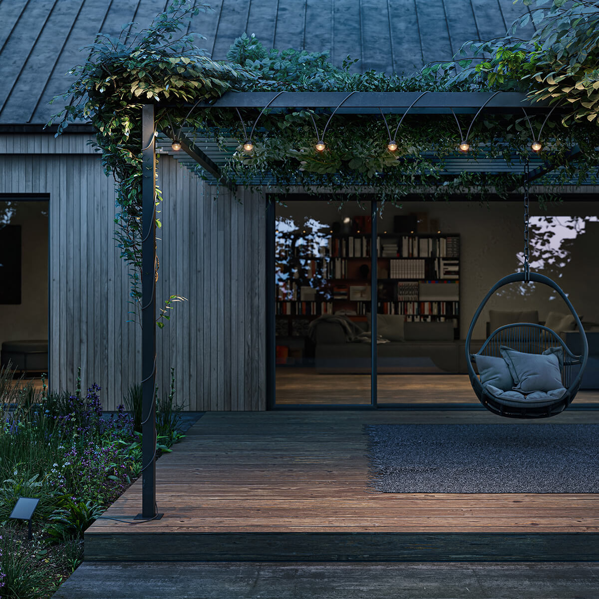 Dank des effizienten Solarpanels versorgt sich die Lichterkette selbst mit Energie und leuchtet so völlig unabhängig von Steckdosen und Energiesäulen. Bricht die Dämmerung an, schaltet sie sich selbstständig für die Dauer von etwa 5 Stunden ein. Vollständig aufgeladen, bietet die Solarlampe bis zu 15 Stunden kabelloses Licht. Das entspricht etwa drei Abenden.