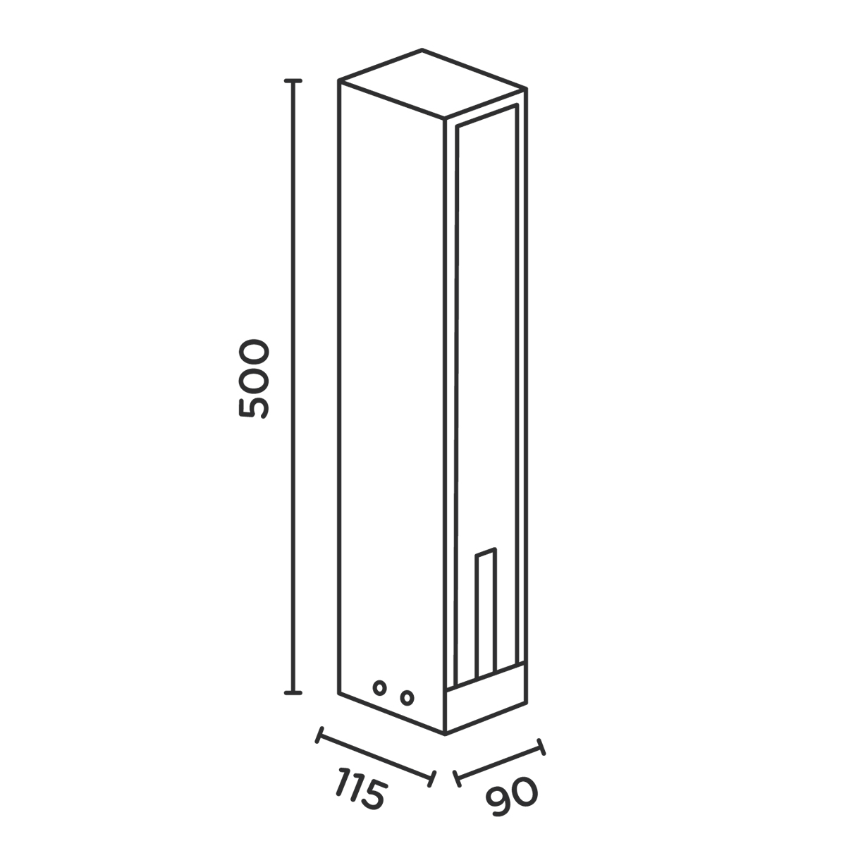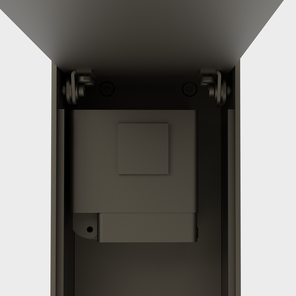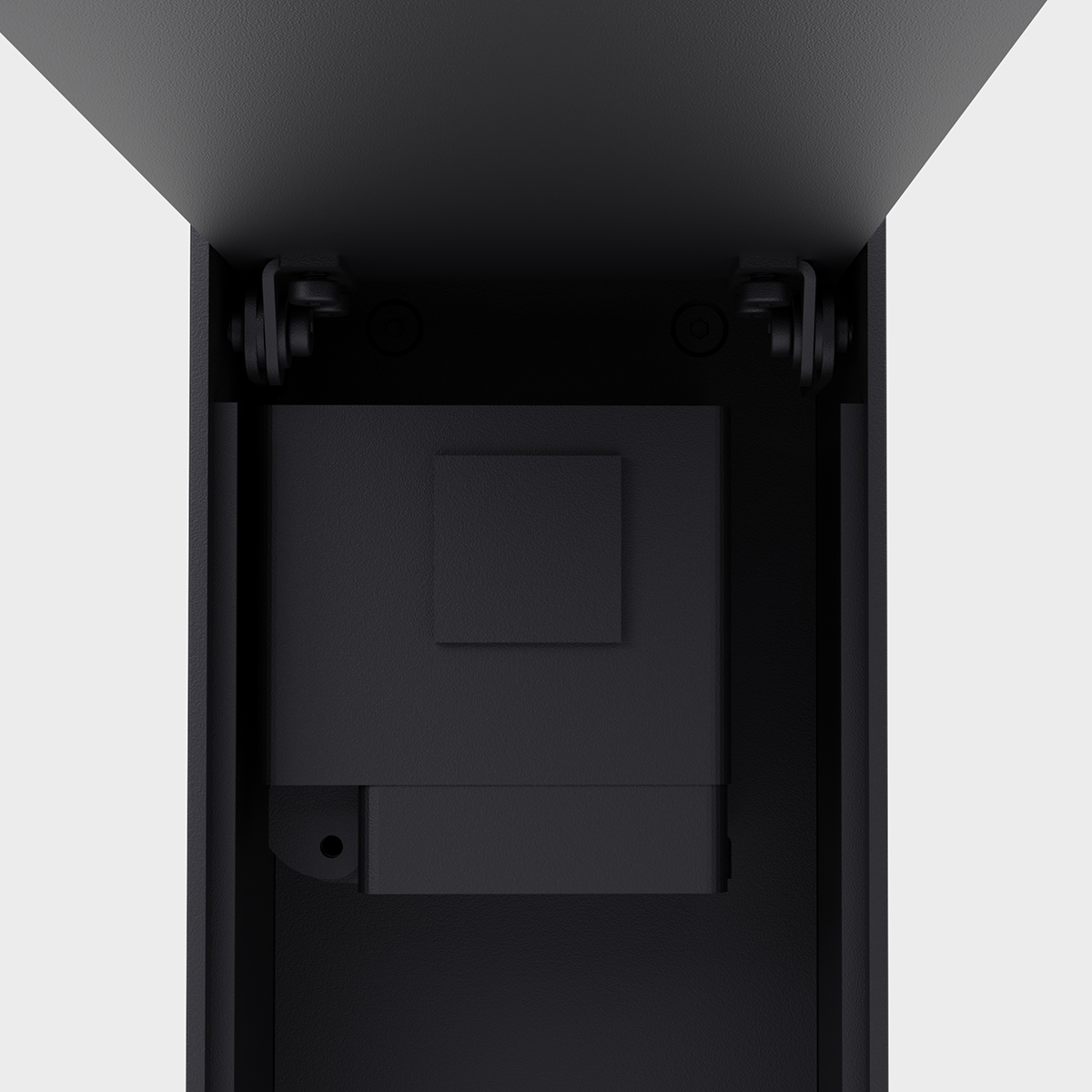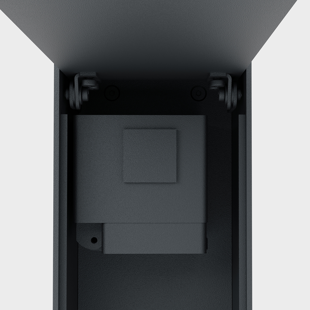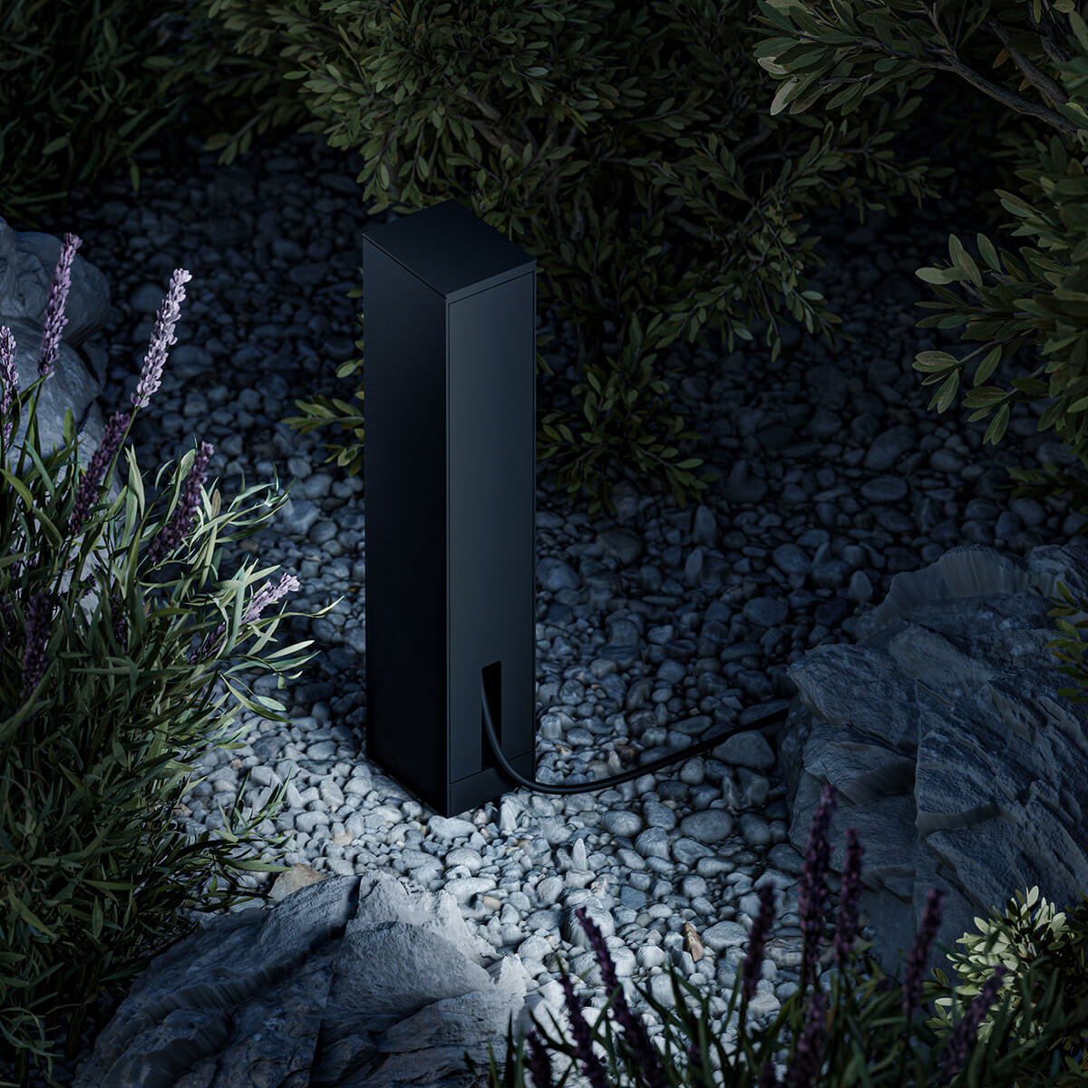 Der Clou des Designs: Die beiden Steckdosen im Innern der Säule sind hinter einer schlanken Abdeckplatte verborgen und damit unsichtbar für das Betrachterauge. Die Kabelführung erfolgt durch den vertikalen Spalt, der der Abdeckklappe im unteren Bereich eingelassen ist. Auf diese Weise bleiben die eher unschönen Elemente von Steckdosen und Anschlusskabeln verborgen – ein deutlicher Vorteil gegenüber konventionellen Steckdosensäulen.