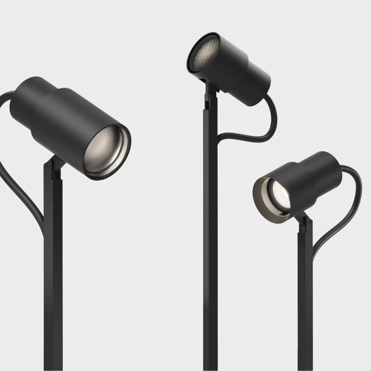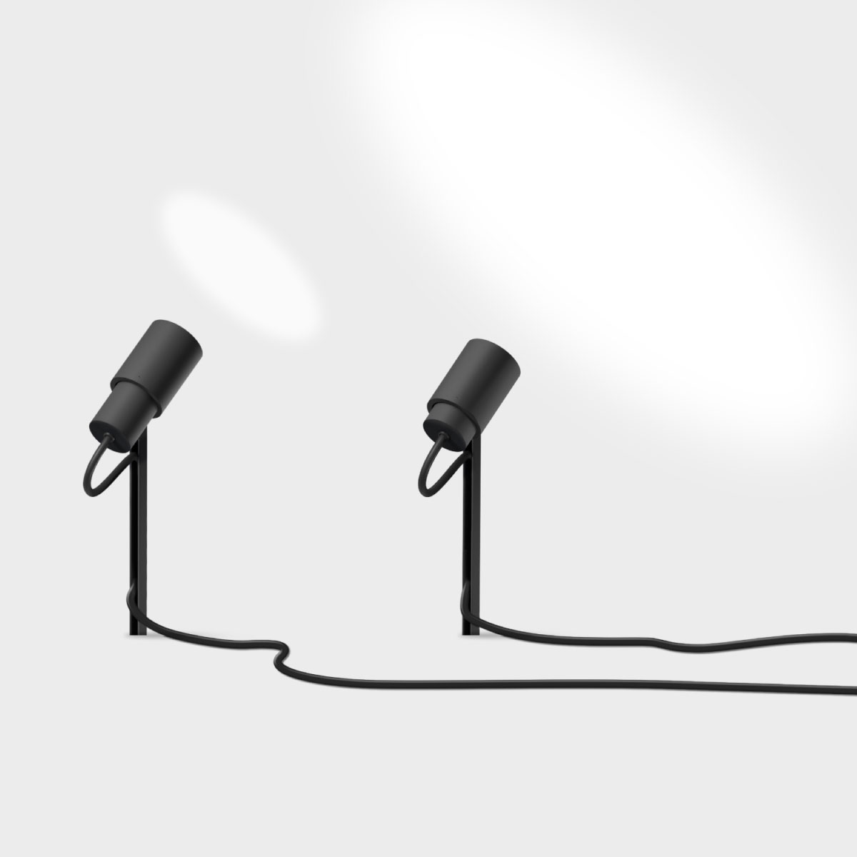 IP44.DE Piek Cover L, deep black (schwarz), die Abbildung zeigt alle drei Cover L, S und C (v.l.n.r.) an drei Spießstrahlern (Strahler nicht im Lieferumfang inbegriffen)