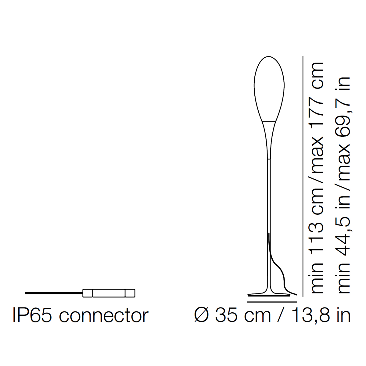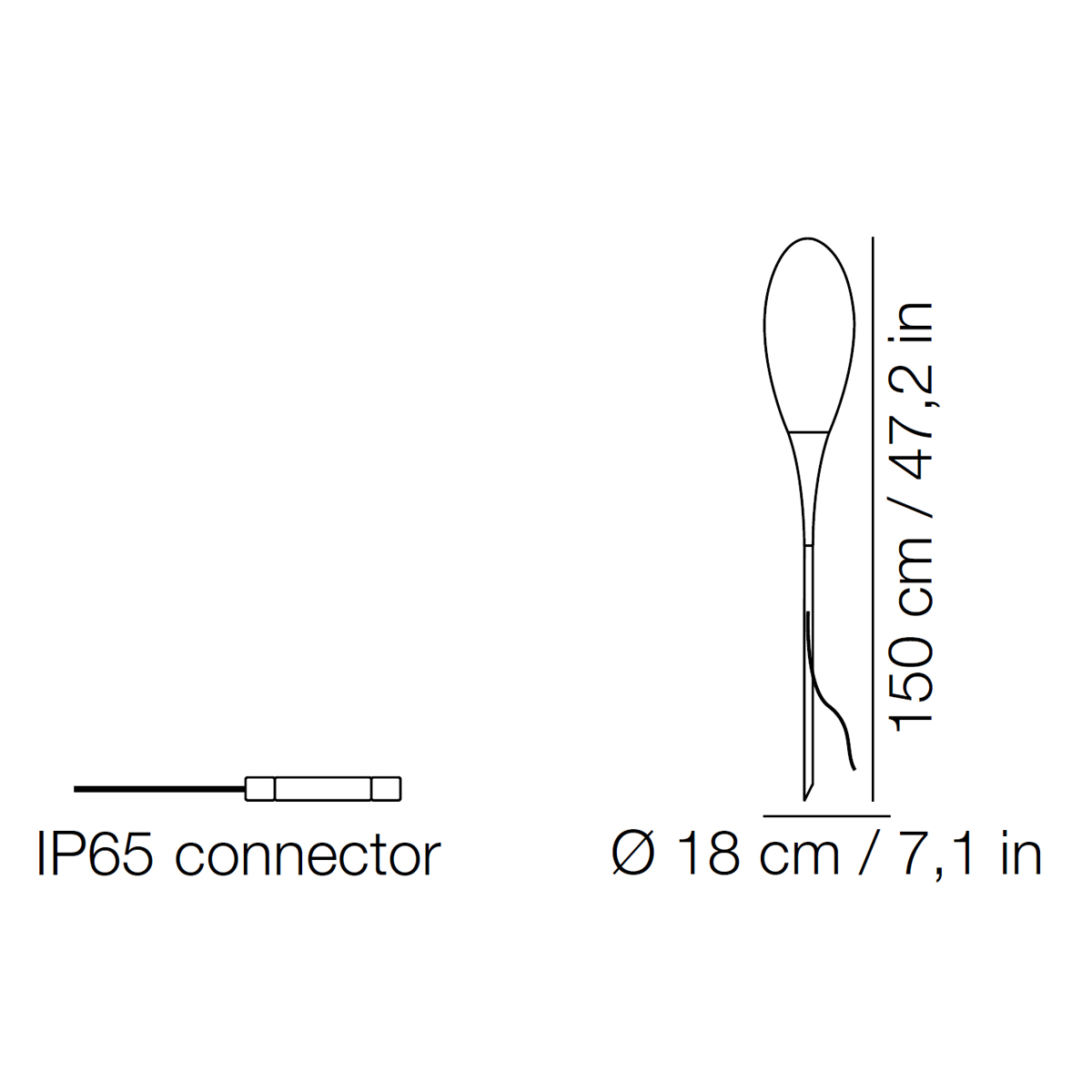 Zu erwerben ist die Stehlampe mit einem Erdspieß zur Installation im Erdreich sowie mit einer verschraubbaren Bodenplatte zur fixen Montage. Als Zuleitung fungiert ein orangefarbenes Neoprenkabel mit IP65-Verbindungseinheit, das das moderne Design der Spillo Outdoor gekonnt abrundet.
