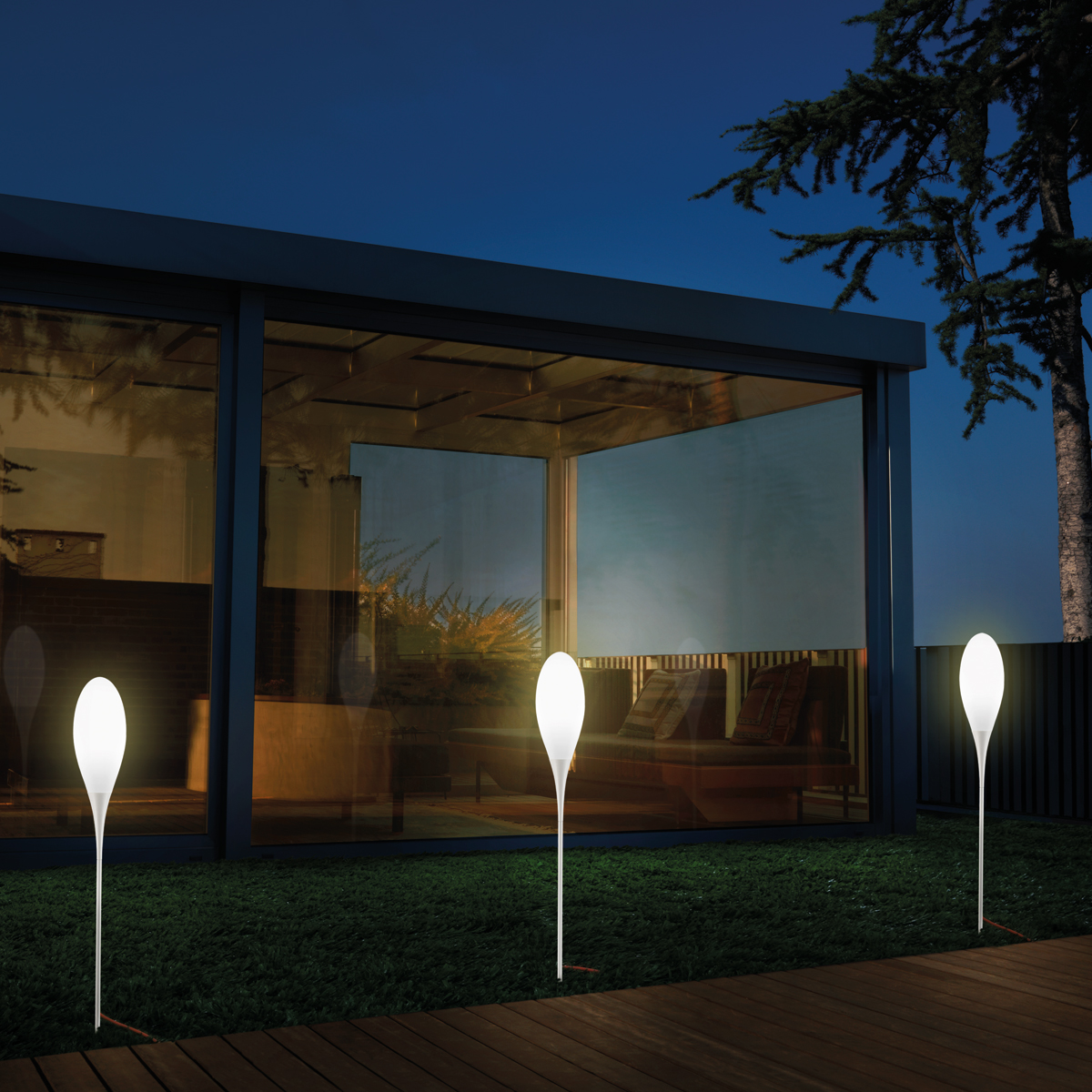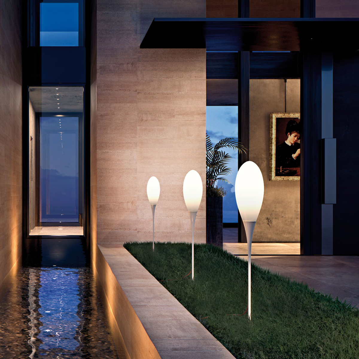 Mit der Spillo Outdoor hat der deutsche Designer Constantin Wortmann eine elegante Leuchte für den Außenbereich geschaffen. Mit ihrem sanft gerundeten Schirm aus weißem Polyethylen erinnert die Lampe an einen emporsteigenden Wassertropfen – eine passende Assoziation für eine Außenleuchte. Das Licht der Spillo Outdoor wird diffus gestreut und hüllt Garten und Terrasse in ein angenehmes Licht.