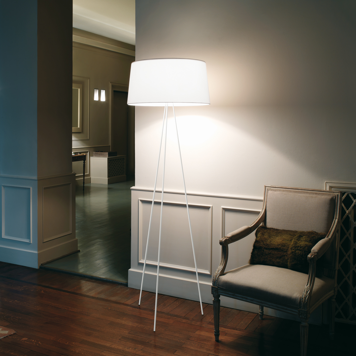 Die von Christophe Pillet entworfene Tripod macht ihrem Namen alle Ehre. Ein dreibeinige Metallstruktur dient der Stehlampe als Standfuß und verleiht ihr Grazilität und eine moderne Linie. Der Leuchtenschirm ist aus feuerfestem Stoff gefertigt und in weißer Tönung gehalten. Verschlossen wird der Diffusor von einer durchlöcherten, eloxierten Aluminiumscheibe. Mit ihrem Stoffschirm erzeugt die Kdln Tripod Floor ein warmes und raumgreifendes Licht, das einen jeden Wohnbereich auf diskrete Weise aufwertet.