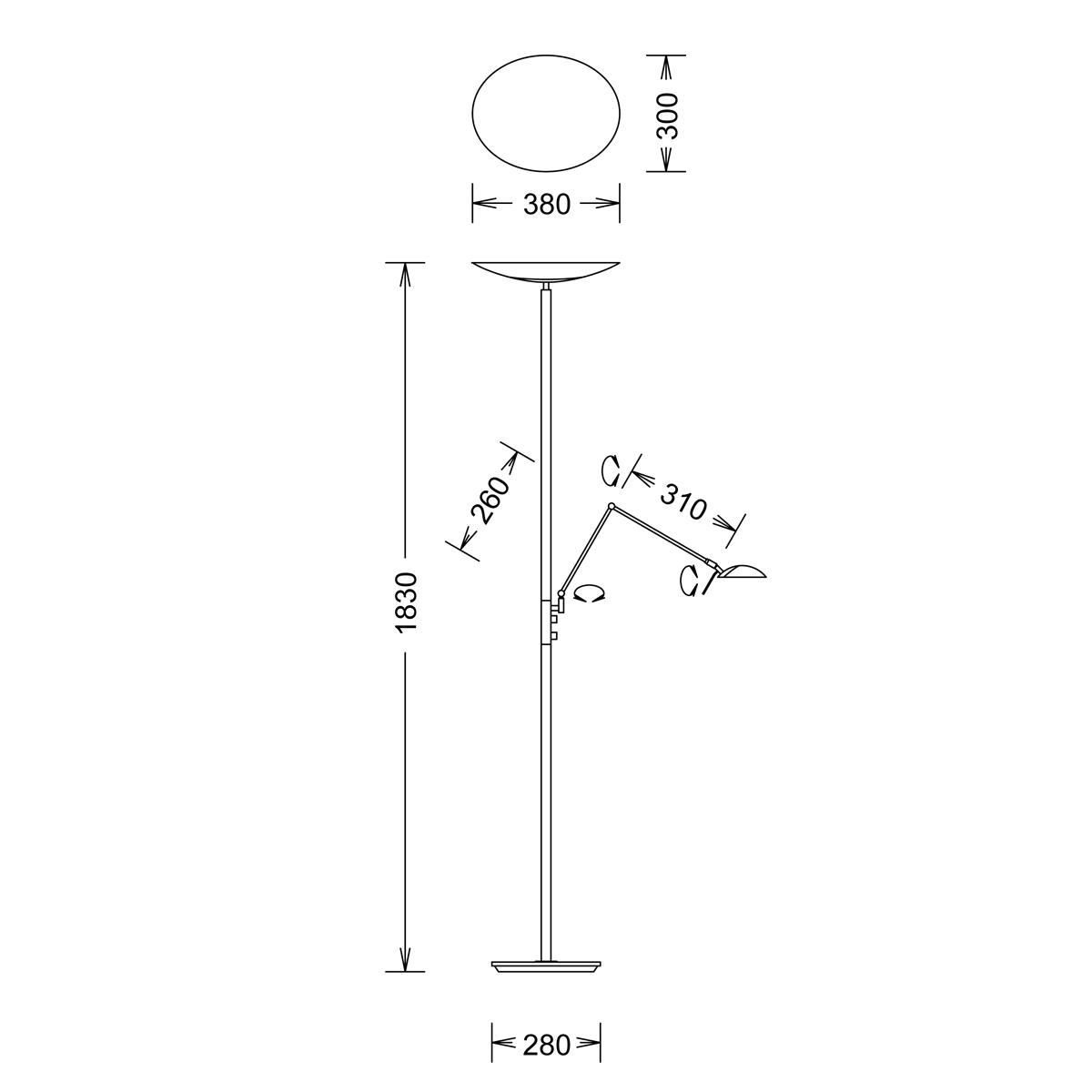 - Fluter und Leselicht sind getrennt dimmbar via Tastdimmer im Schaft bzw. Reflektor