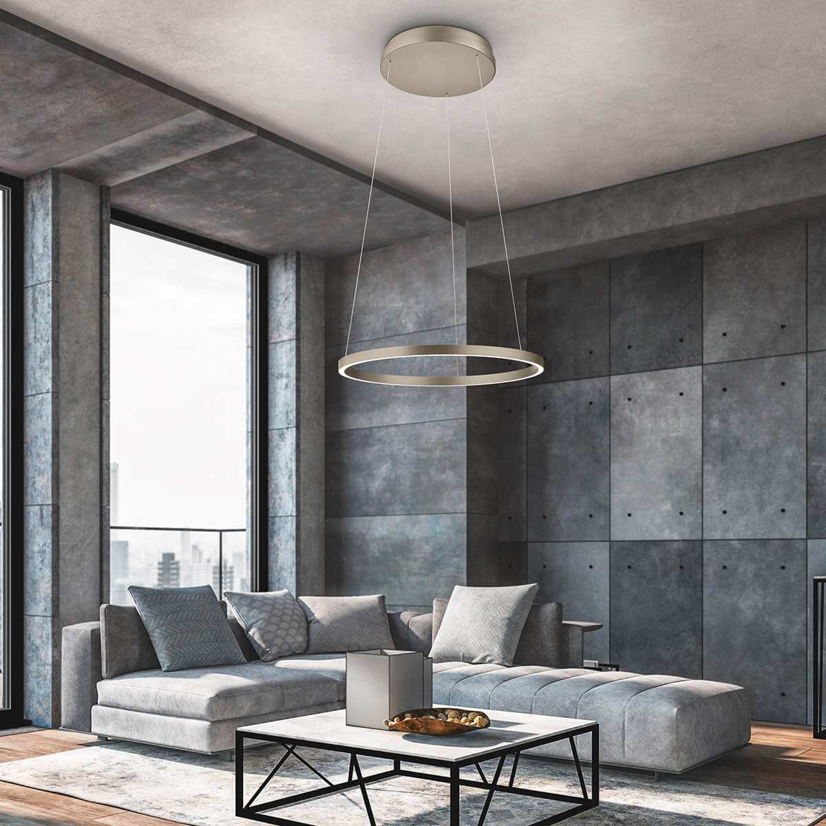 Bei der Lisa LED Pendelleuchte der deutschen Qualitätsmarke Knapstein handelt es sich um eine ringförmige Hängeleuchte, die in drei verschiedenen edlen Oberflächen erhältlich ist und für eine schöne Ausleuchtung in Ihrem Essbereich sorgt. Lichtstärke und Farbtemperatur von Direkt- und Indirektlicht lassen sich separat voneinander einstellen und erlauben damit größtmögliche Flexibilität.