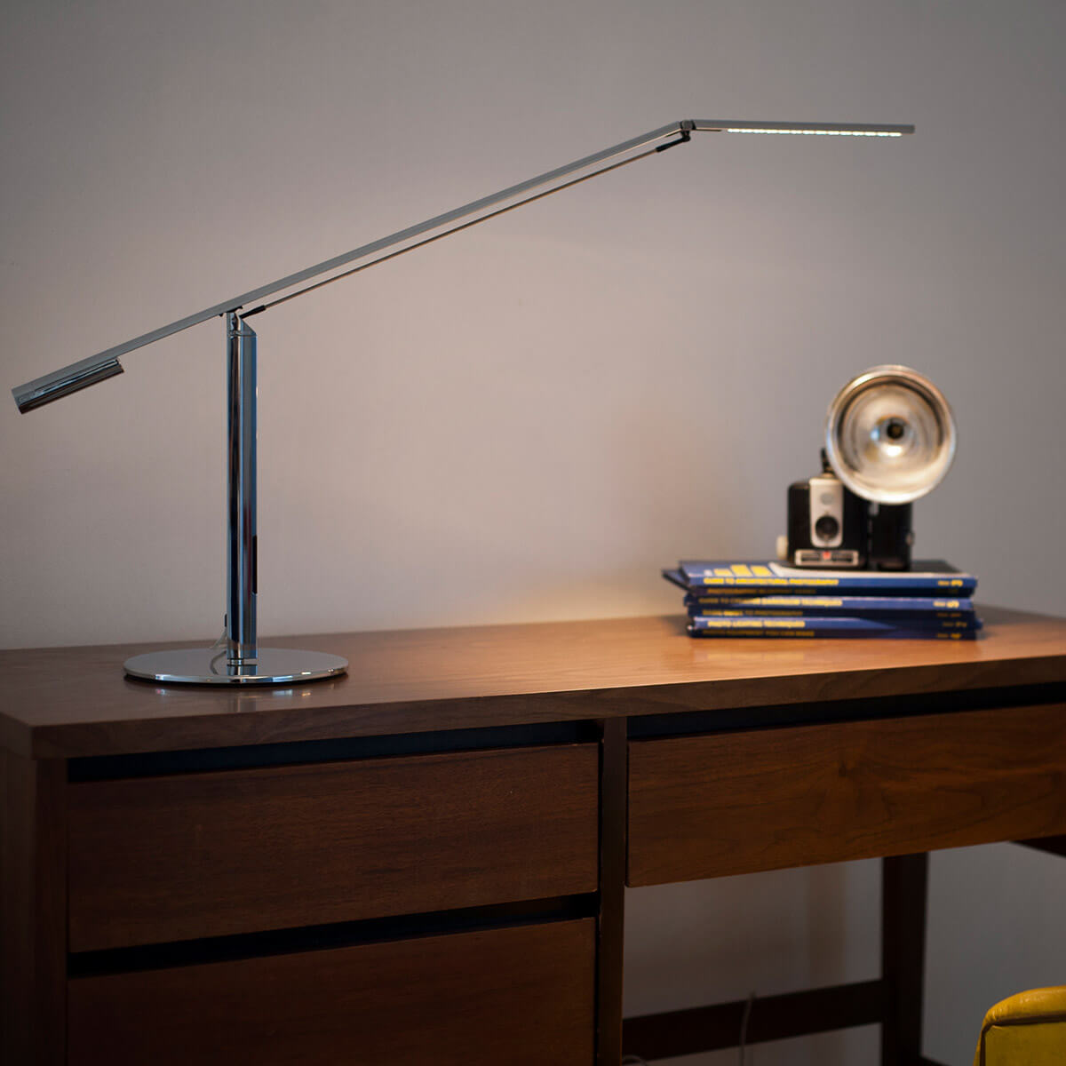 Mit ihrer klaren und einfachen Gegengewichtskonstruktion sorgt die Equo Tischleuchte für federleichte Einstellbarkeit. Mit nur einem Finger kann der Leuchtenarm gehoben oder gesenkt werden, wobei der schmale Leuchtenkopf stets in genau dem von Ihnen festgelegten Einstellungswinkel verharrt.